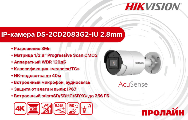 Видеокамера IP Hikvision DS-2CD2083G2-IU(2.8mm) 2.8-2.8мм цветная Ds-2cd2083g2-iu(2.8mm)