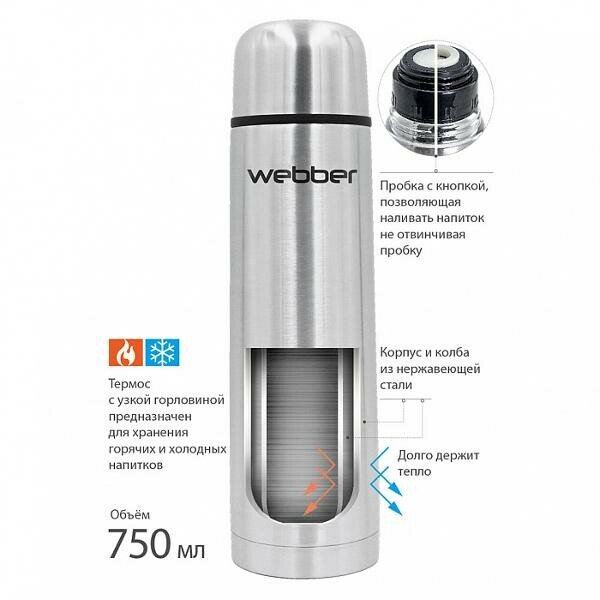 Термос Weber, SS-750P, 750 мл, нержавеющая сталь, пробка с кнопкой для наливания, стальной