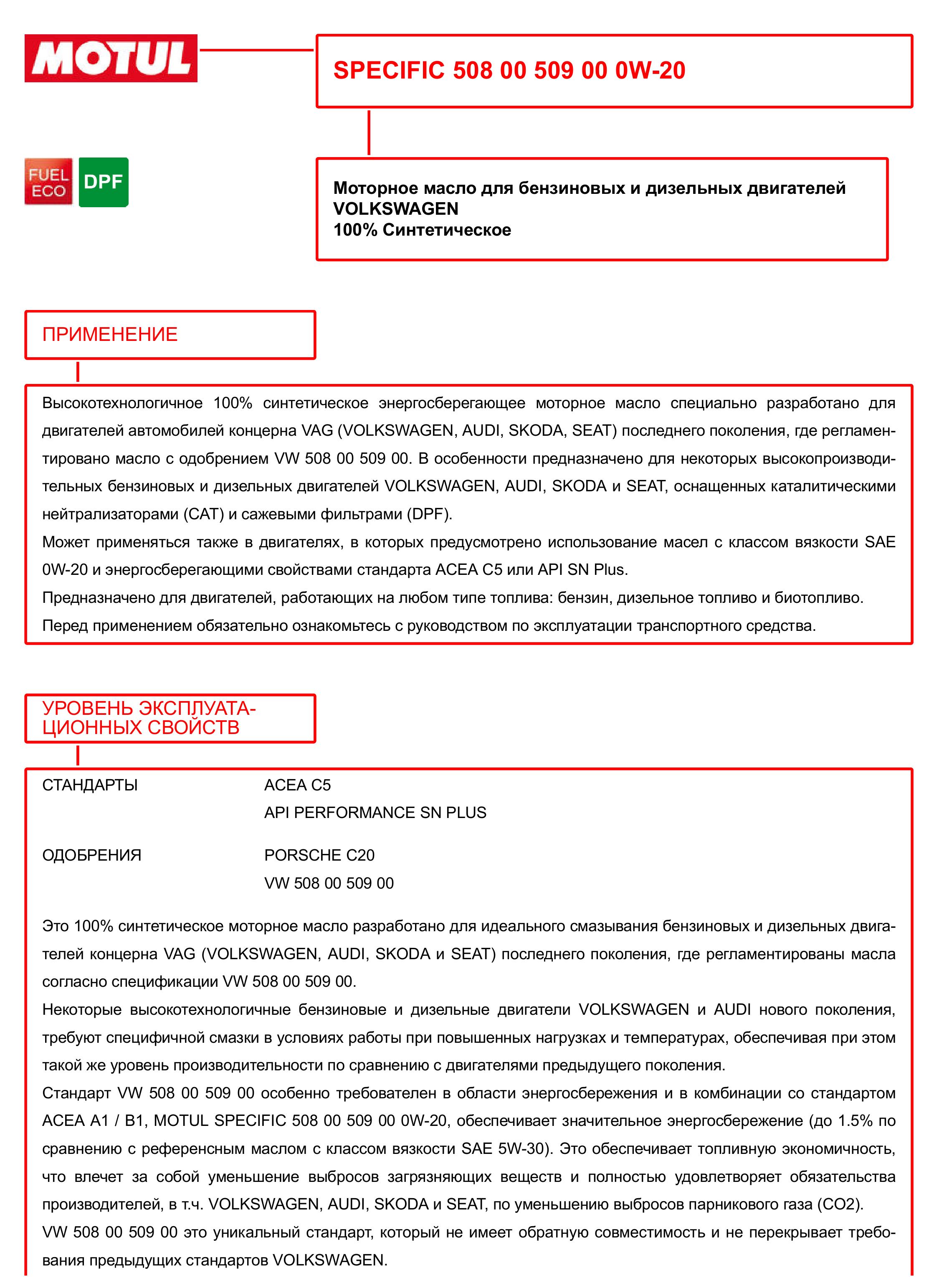 | Дополнительная информация | Спецификация Porsche C20 очень требовательна к моторному маслу в разрезе стойкости масляной пленки. Данная спецификация регламентирована для всех двигателей PORSCHE, где требуется масло согласно указанному стан- дарту, такие как Porsche Macan R4, за исключением китайского рынка. MOTUL SPECIFIC 508 00 509 00 0W-20 обеспечивает превосходную стойкость масляной пленки, при этом облег- чает низкотемпературный пуск, снижает трение, поддерживает необходимое давление масла и снижает рабочую температуру двигателя. Класс вязкости SAE 0W-20 снижает гидродинамическое трение и обеспечивает топливную экономичность в усло- виях низких температур. Благодаря своим исключительным смазывающим свойствам, MOTUL SPECIFIC 508 00 509 00 0W-20 обеспечивает высокий уровень износостойкости, сопротивление воздействию высоких температур и окислению. Противодей- ствует образованию отложений, снижает износ и обеспечивает снижение расхода масла на угар. Обладает противоизносными, антикоррозионными и антипенными свойствами. |