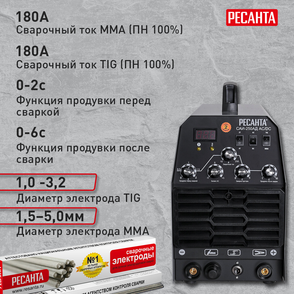 Сварочный аппарат инверторного типа РЕСАНТА САИ-250АД AC/DC, TIG, MMA