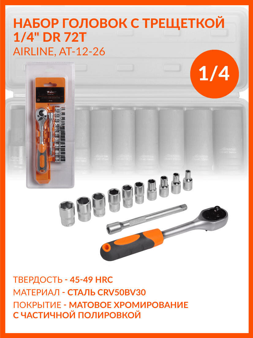 AT1226 AIRLINE Набор головок с трещоткой 1/4 DR 72Т 12пр. (4,5,6,7,8,9,10,11,12,13мм, удлинитель 100мм) (AT-12-26)