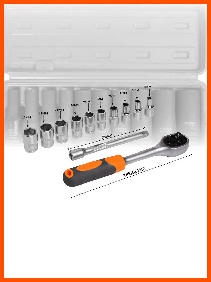 Набор головок с трещоткой 1/4 DR 72Т 12пр. (4,5,6,7,8,9,10,11,12,13мм, удлинитель 100мм)