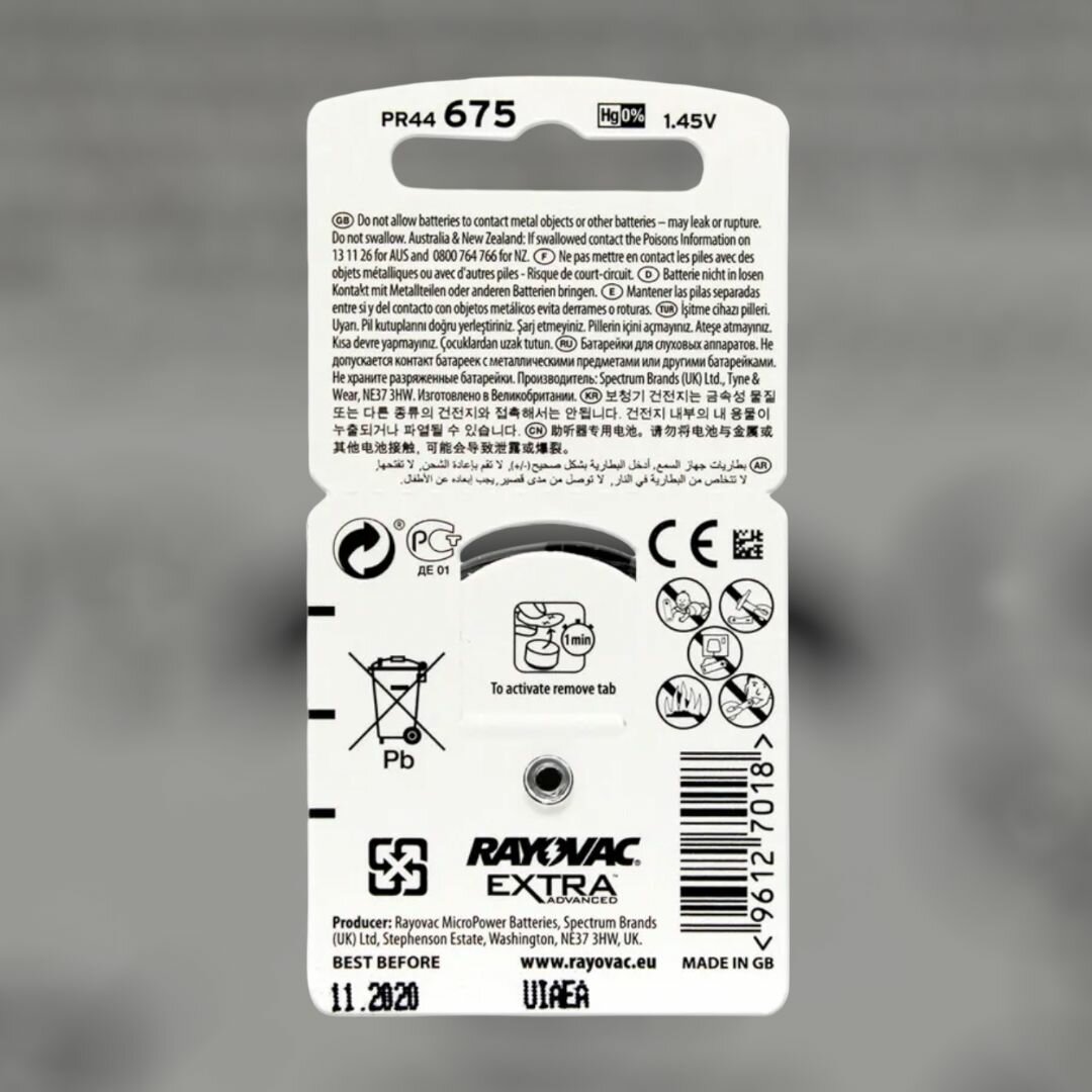 Батарейки Rayovac Extra 675 (PR44) для слуховых аппаратов, 5 блистеров (30 батареек)