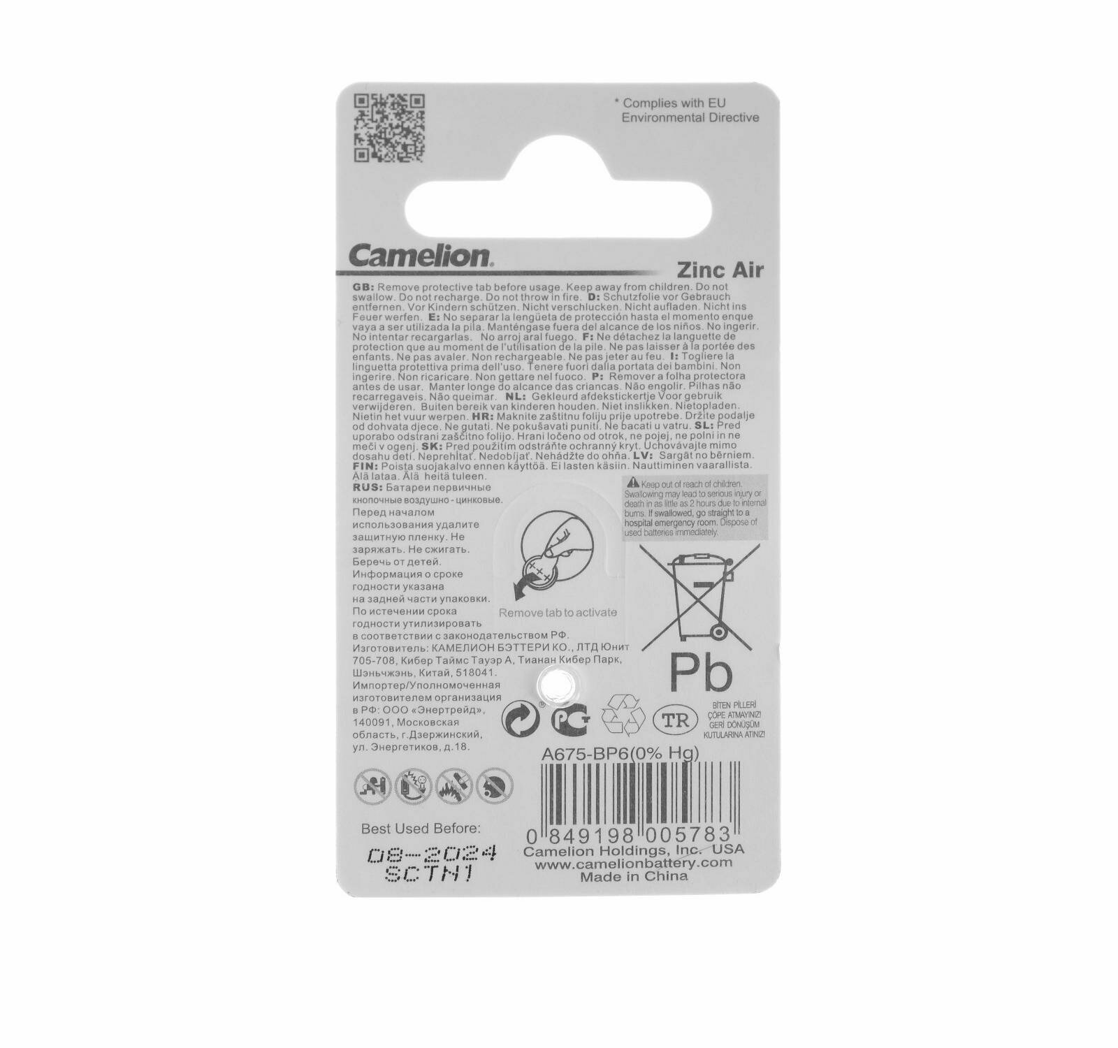 Camelion ZA675 BL-6 Mercury Free A675-BP6 0%Hg , батарейка для слуховых аппаратов, 1.4 V,620mAh 6 шт. в уп-ке