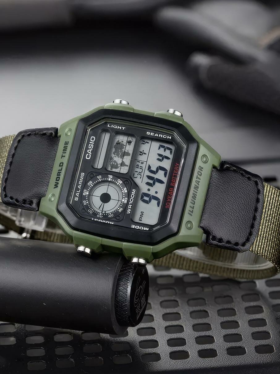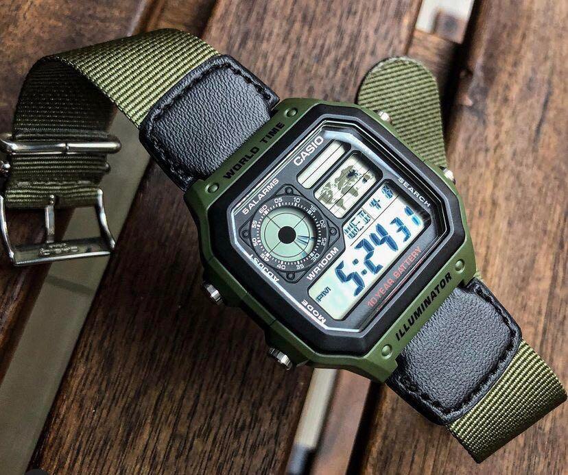 AE-1200WHB-1B Casio наручные часы кварцевые WR100 (10 атм) мужские, женские хаки таймер обратного отсчета, секундомер будильник отображение числа, второй часовой пояс, отображение дня недели, отображение месяца водонепроницаемые, подсветка дисплея акрилов