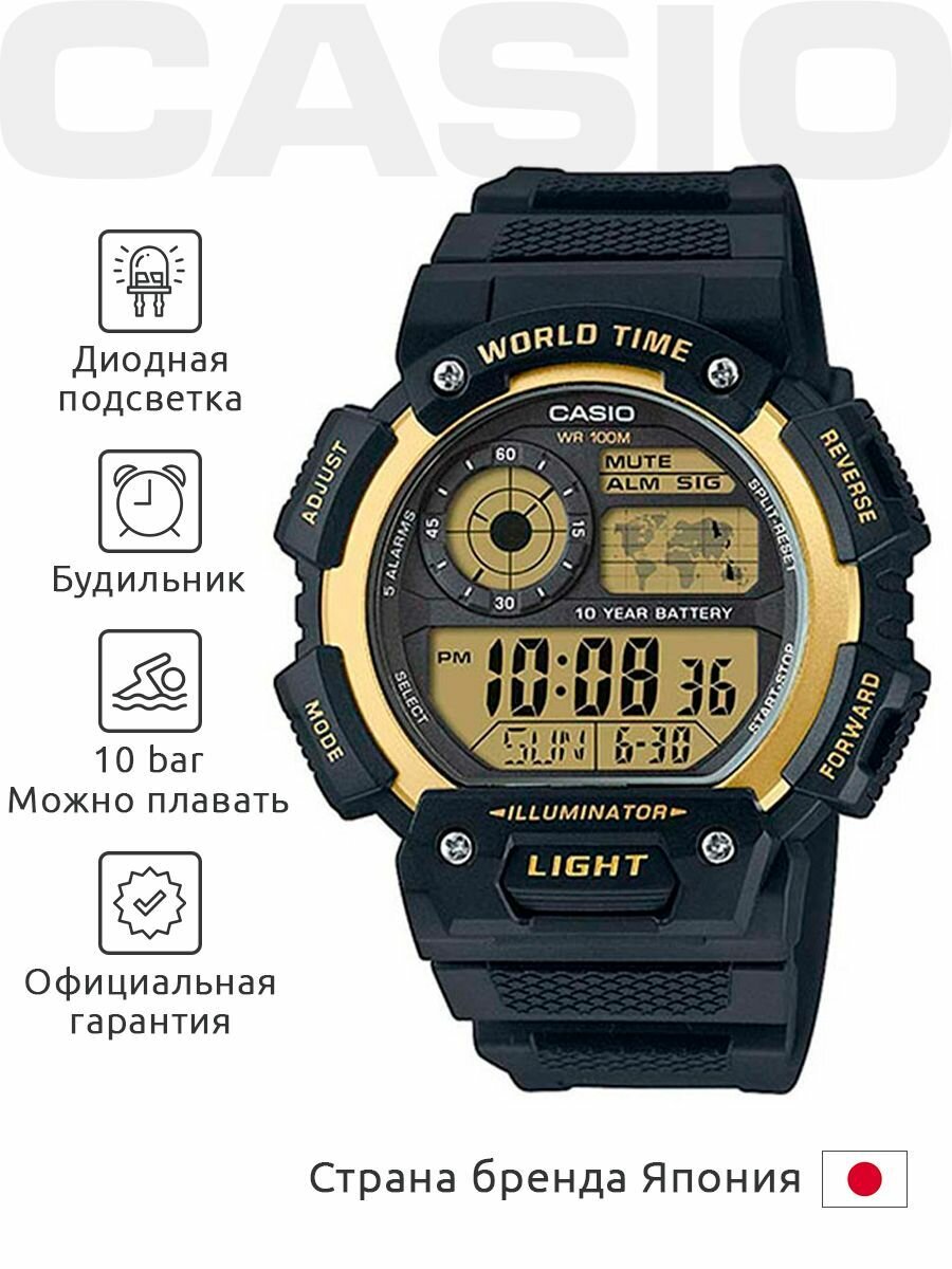 Наручные часы CASIO Collection AE-1400WH-9A кварцевые, будильник, хронограф, секундомер, таймер обратного отсчета, водонепроницаемые, подсветка дисплея, золотой