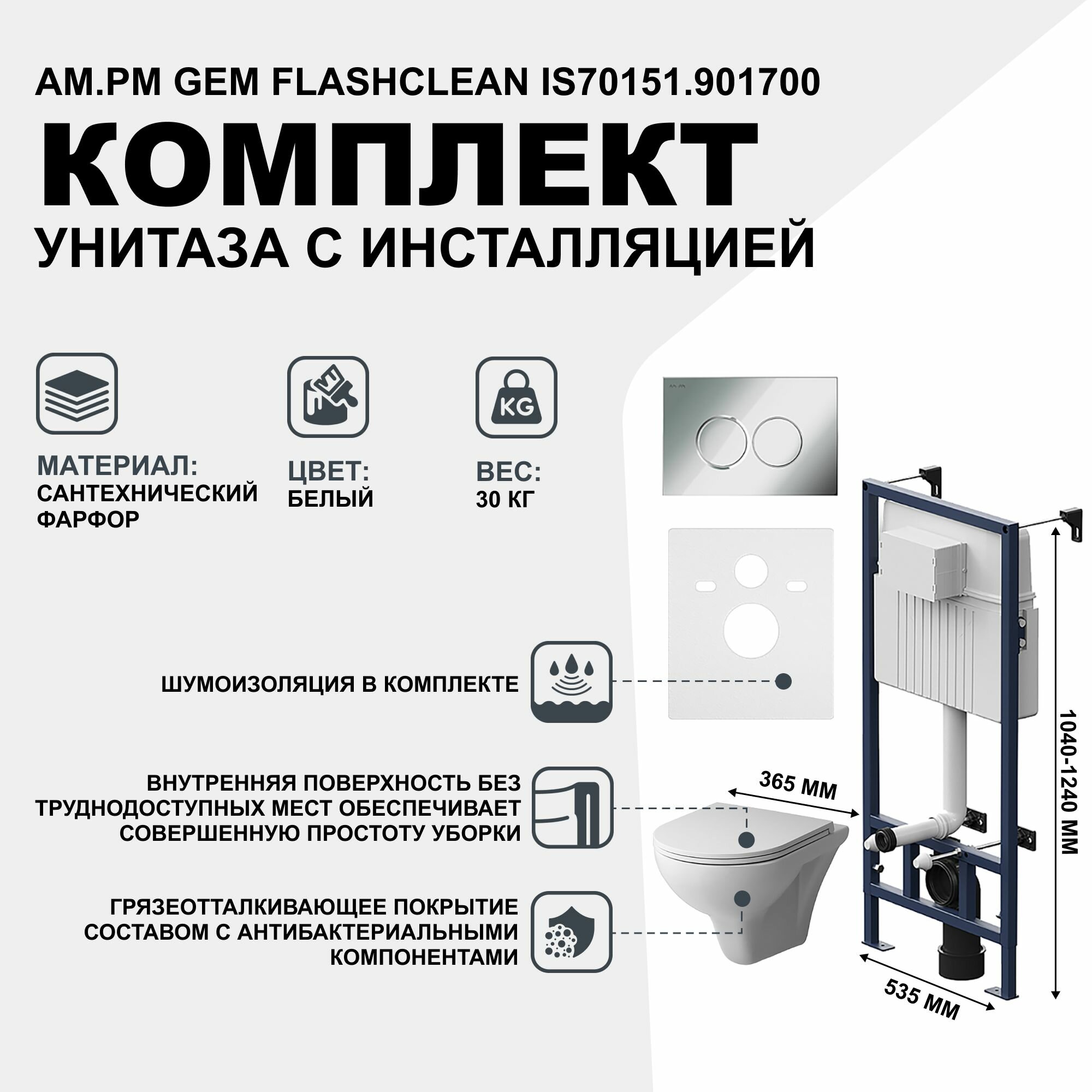 AM.PM Комплект унитаза с инсталляцией AM.PM Gem FlashClean IS70151.901700 с сиденьем Микролифт и клавишей смыва Хром глянцевый