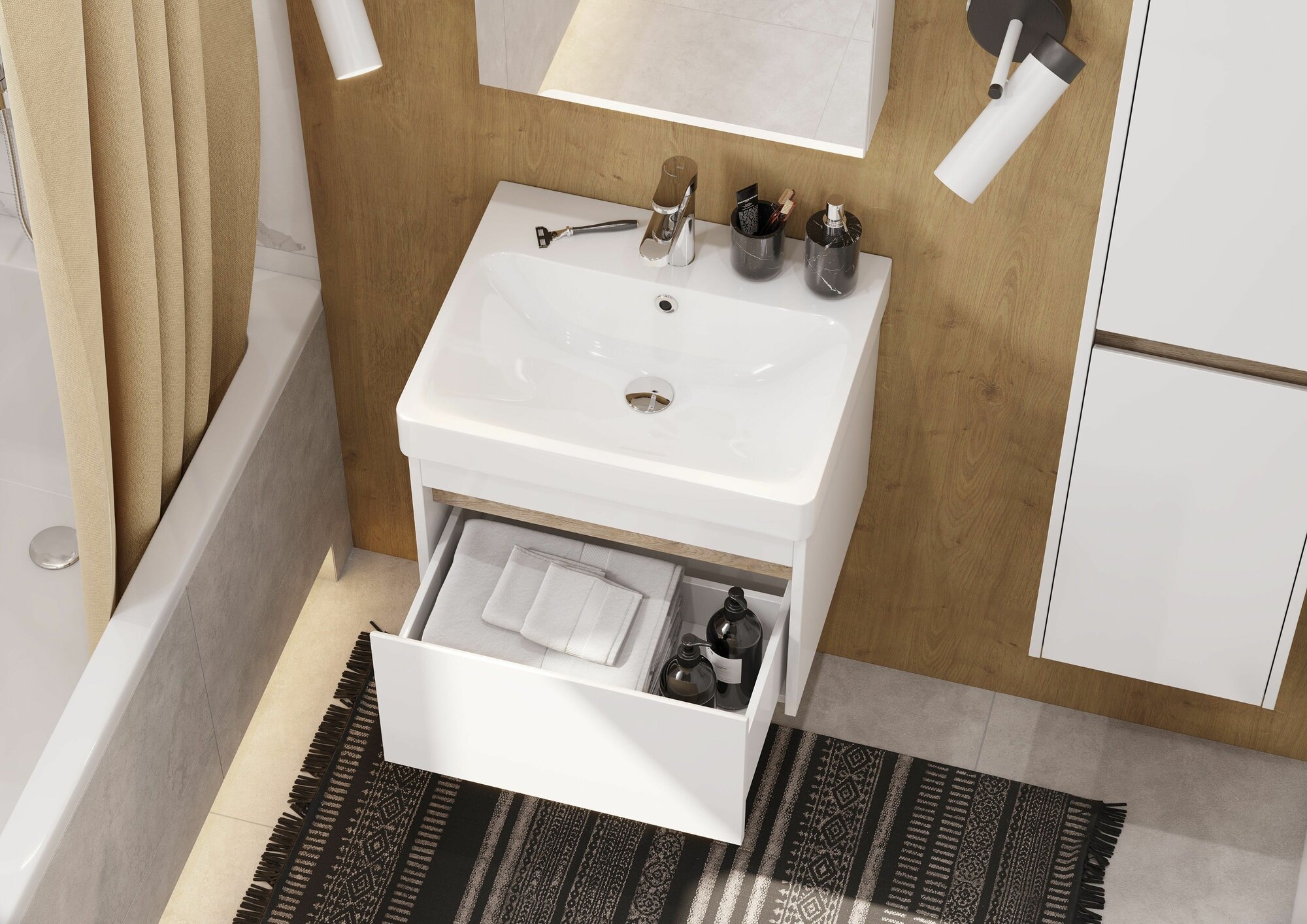 Тумба с раковиной для ванной подвесная с выдвижным ящиком AQUATON 1A2067K1VDAV0 Верди 60 белый/ясень фабрик, раковина Нео 60