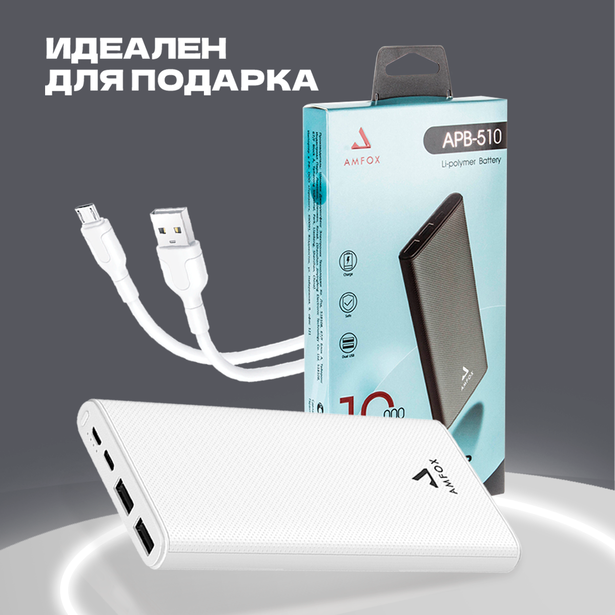 ЗУ Power Bank Повербанк AMFOX APB510 10000 mAh, LiPol, 2.4A, USBx2, microUSB, Type-C, белое