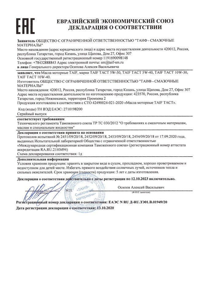 TAIF 211141 Масо моторное TAIF TACT 5W30 A3, B4 CF, SL 4 псинт. интересное: