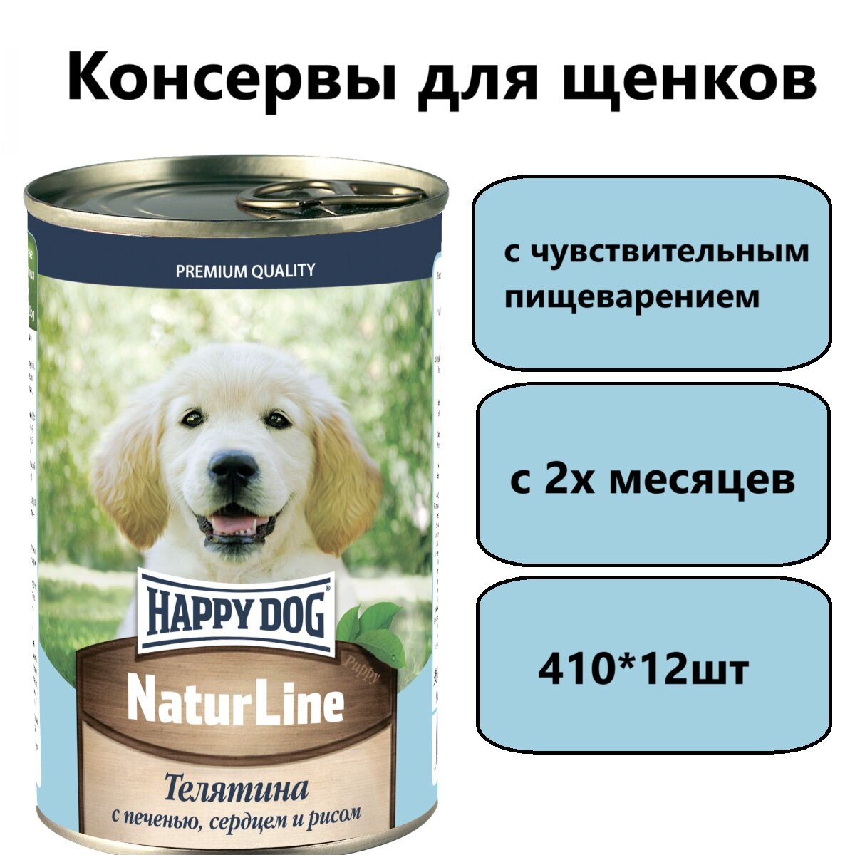 HAPPY DOG для щенков с телятиной, печенью, сердцем и рисом банка 410 гр х 12 шт
