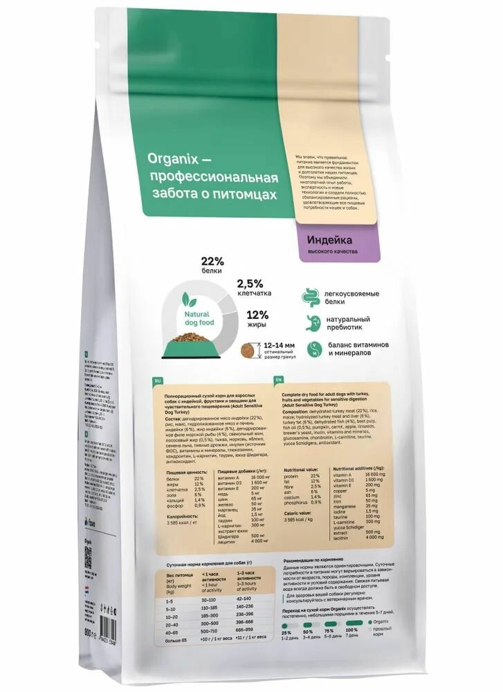 Organix Сухой корм для взрослых собак с индейкой, фруктами и овощами для чувствительного пищеварения, 0,8 кг