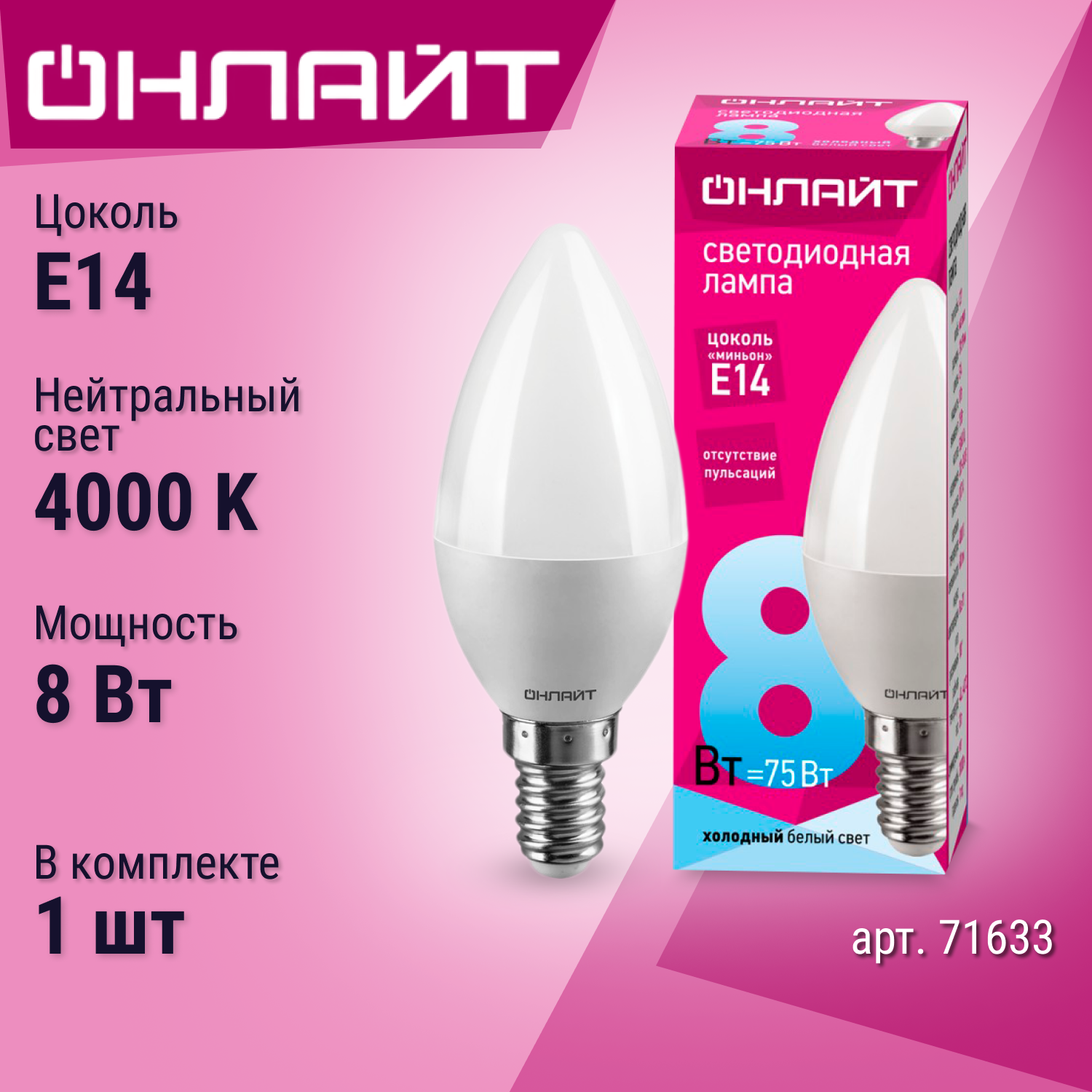Купить Лампа светодиодная E14 онлайт Свеча, 8Вт, 4000К, лампочка 1 шт. 71633