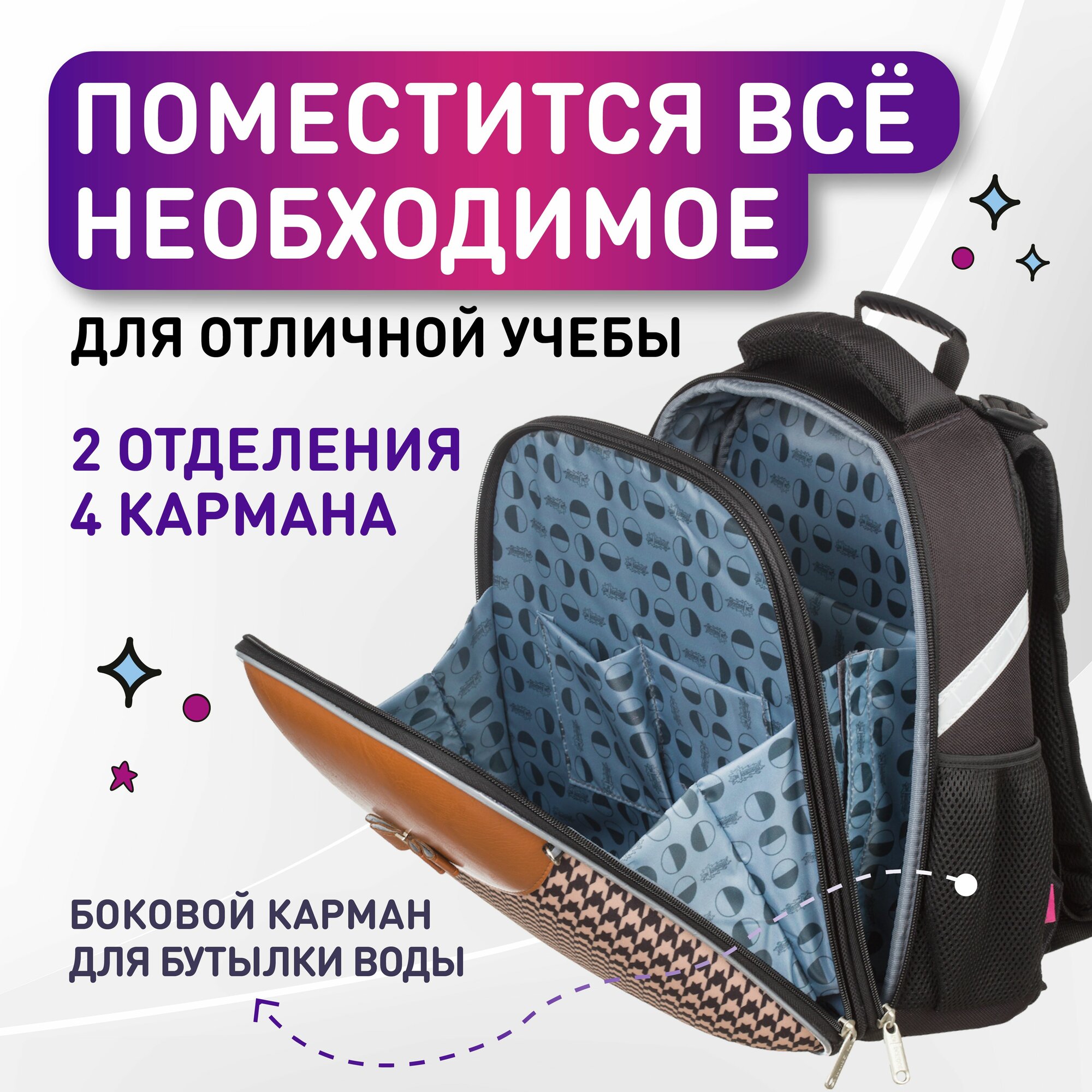 Рюкзак школьный №1 School Звезда, портфель анатомический для девочки, 2 отделения, 4 кармана