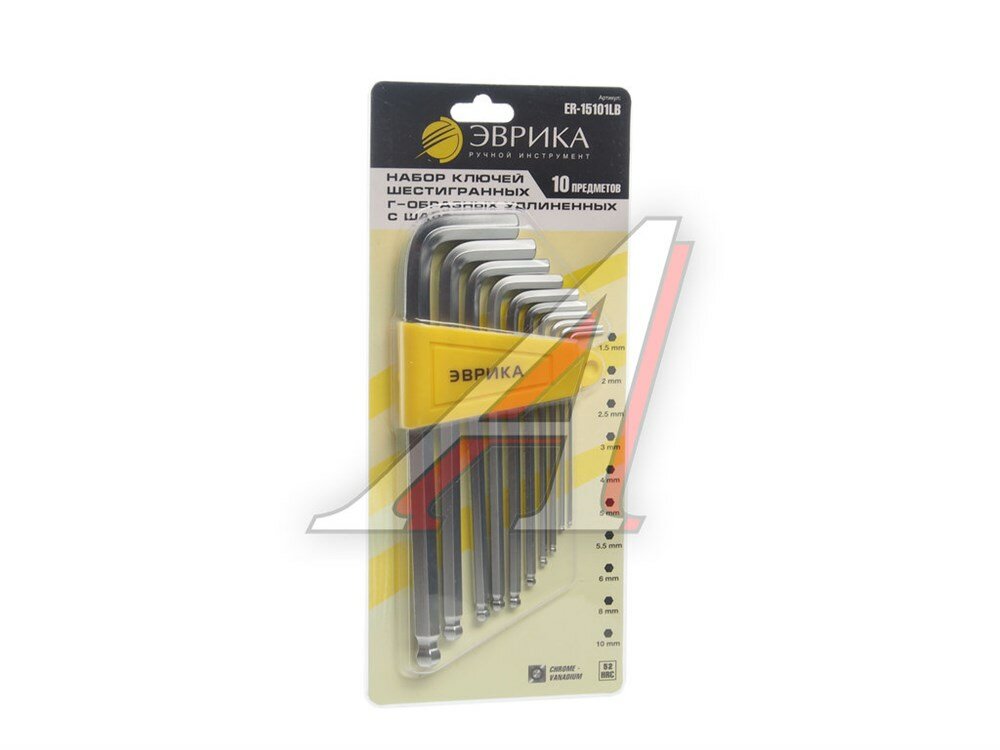 Набор ключей шестигранных 1.5-10мм Г-образных удлиненных с шаром 10 предметов, ER-15101LB, эврика