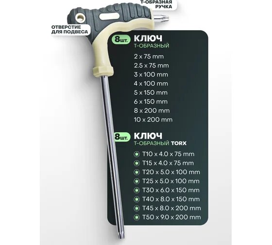 | Ключи имбусовые подробно | НEX: 2, 2.5х75; 3, 4х100; 5, 6х150; 8, 10х200 мм; torx: 10, 15х75; 20, 25х100; 30, 40х150; 45, 50х200 мм |