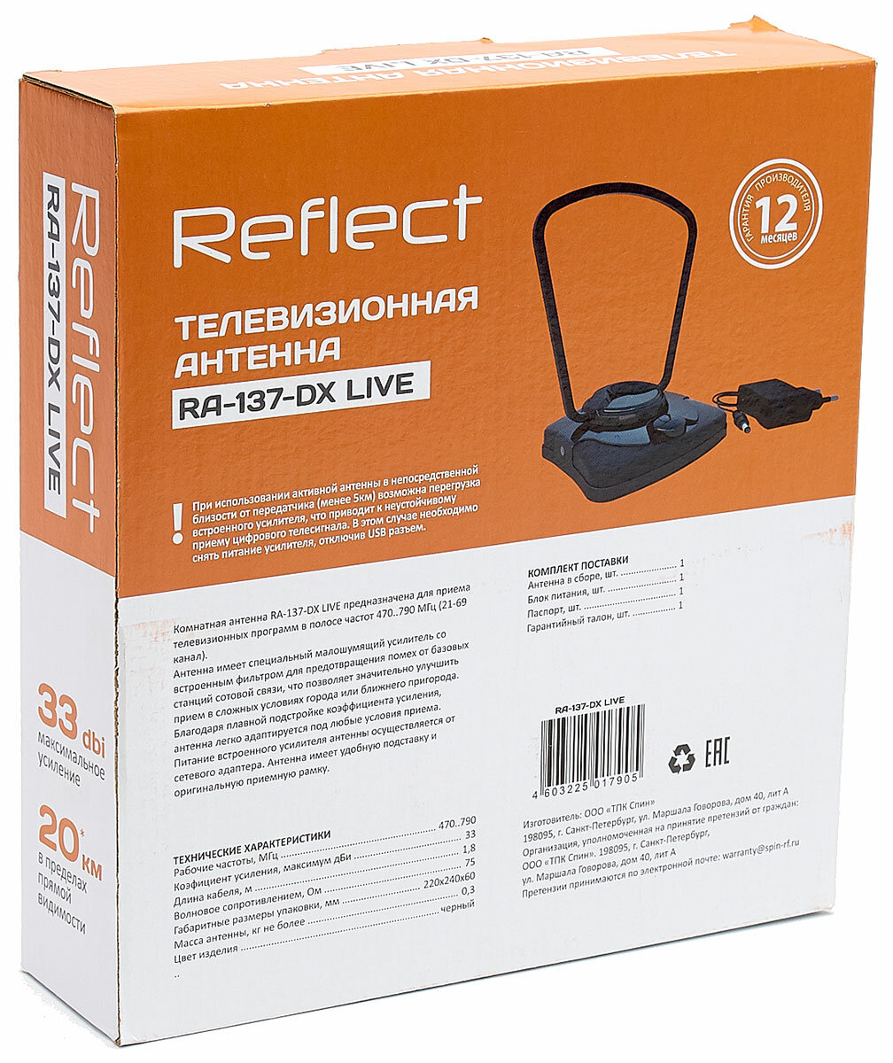 Телевизионная антенна Reflect LIVE RA-137-DX (активная, 5V, ДМВ, с б/п, 33 дБи, коробка)