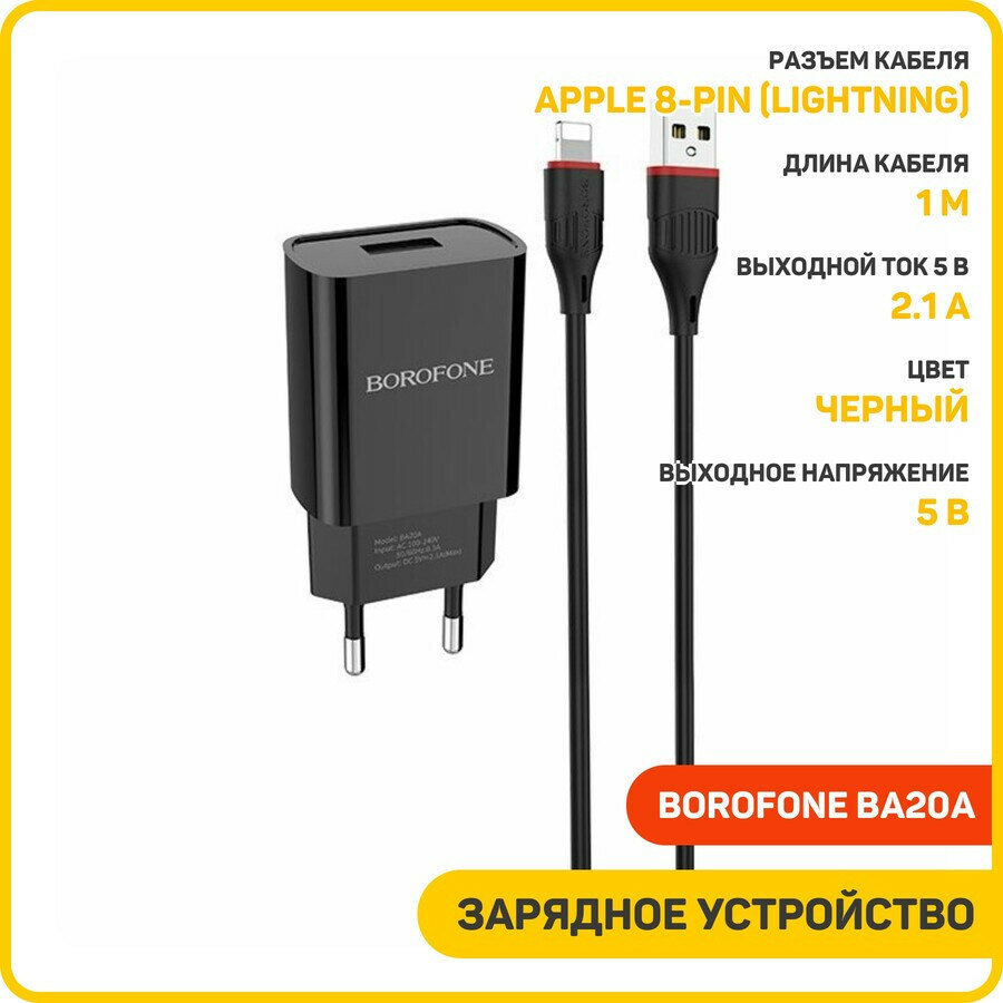 Сетевое зарядное устройство (СЗУ) Borofone BA20A (USB) + кабель Lightning, 2.1 А, черный