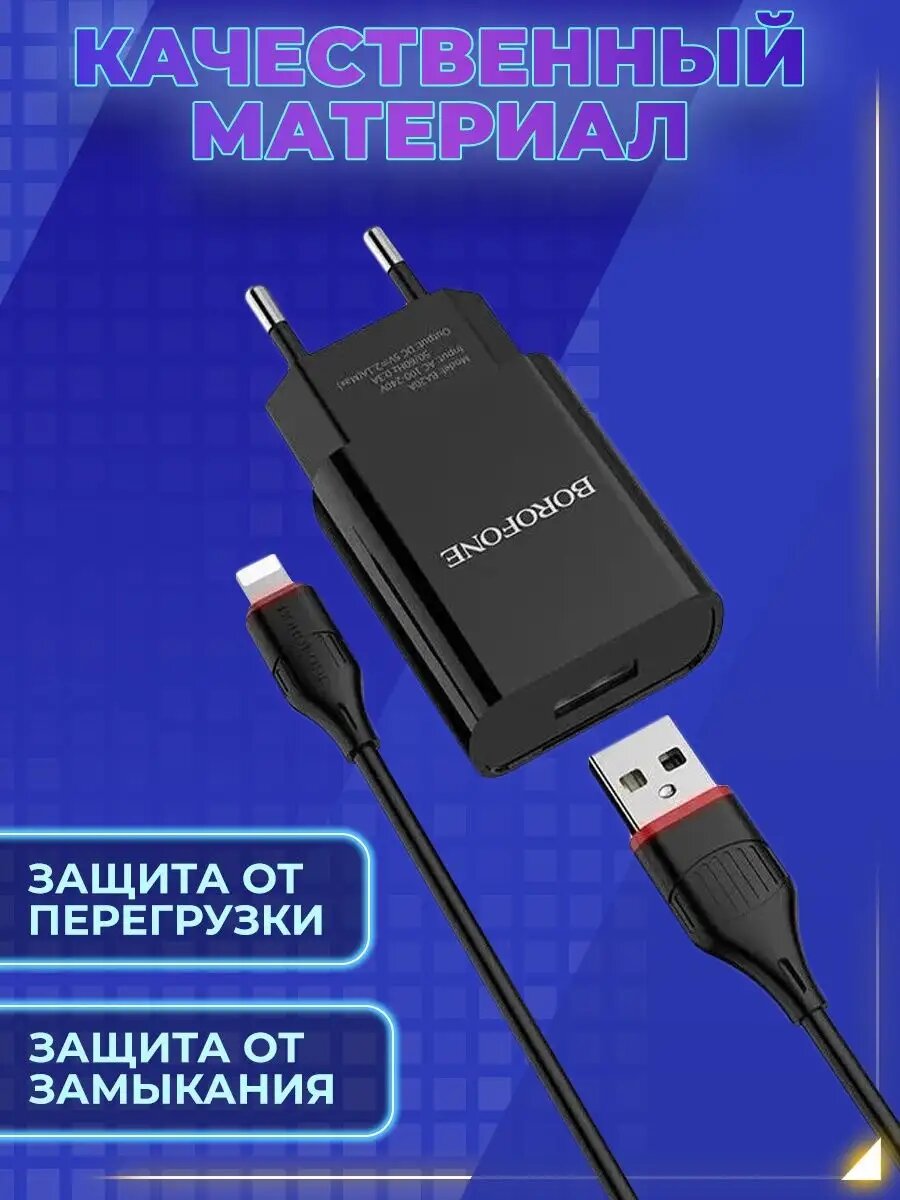 Сетевое зарядное устройство c USB Borofone, BA20A,+Lightning c черное 2.1A