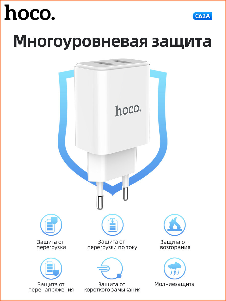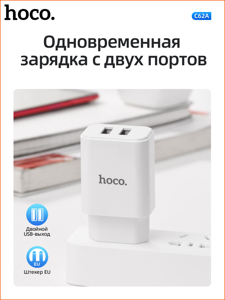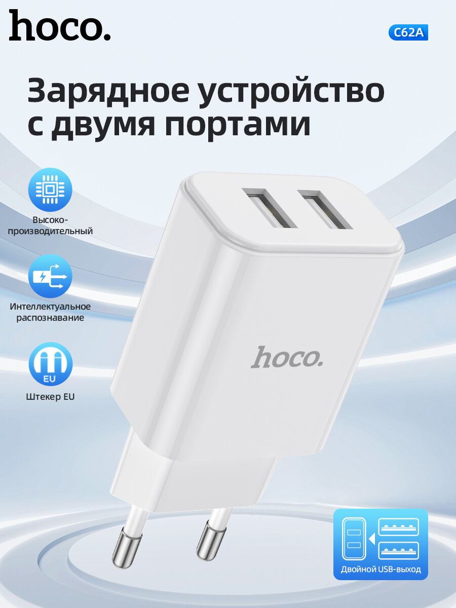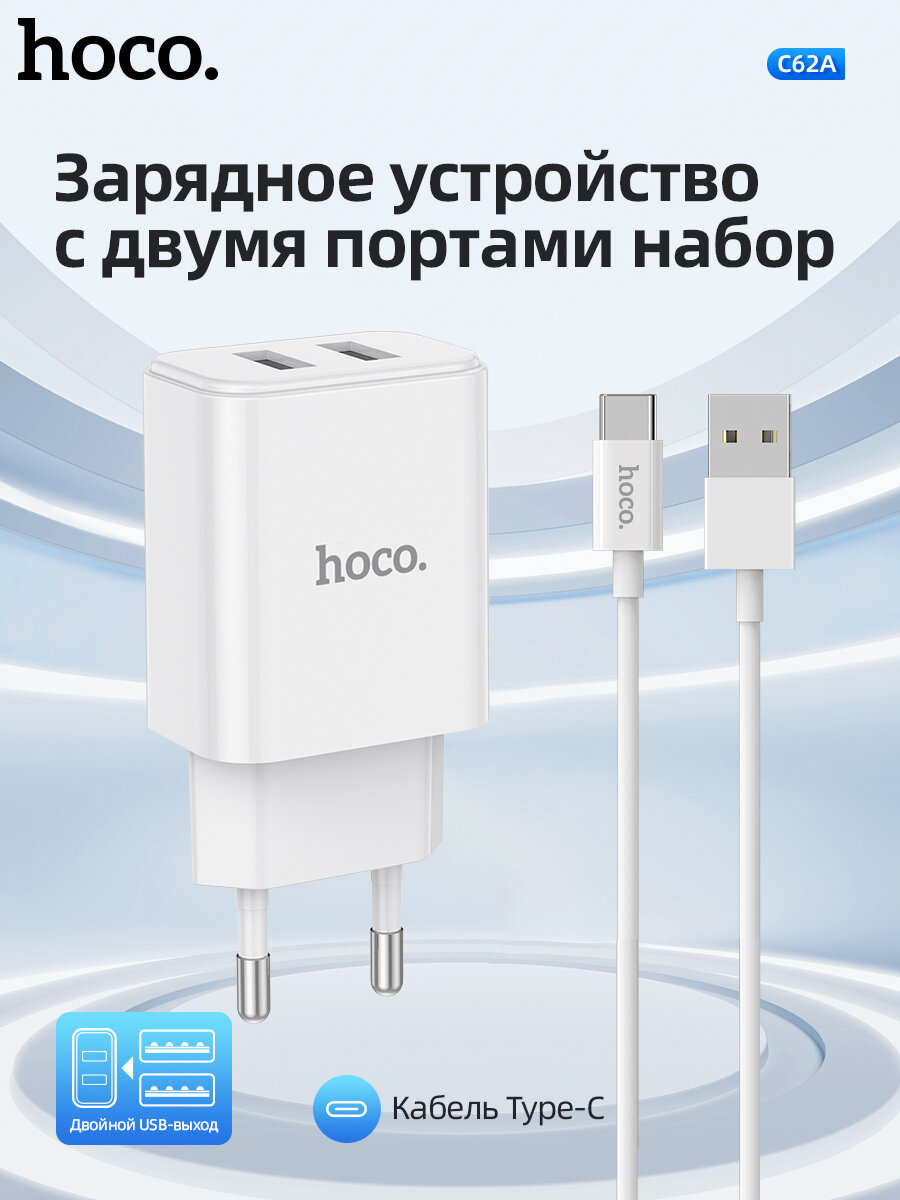 СЗУ, 2 USB 2.1A (C62A), HOCO, Type-C, Умная зарядка, белый