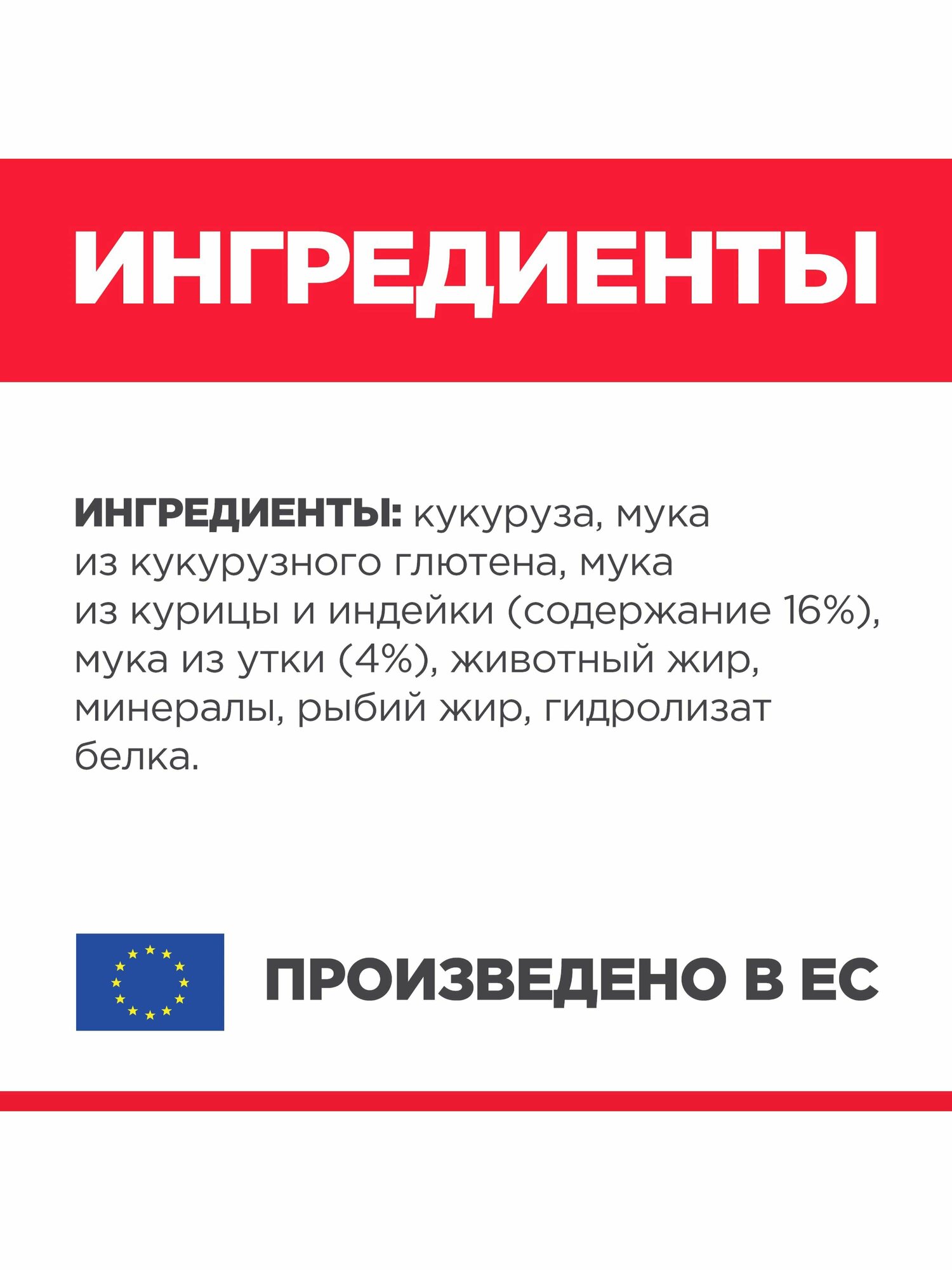 | Состав | Кукуруза, мука из кукурузного глютена, мука из мяса курицы и индейки (общее содержание мяса домашней птицы -16%), мука из мяса утки (4%), животный жир, минералы, рыбий жир, гидролизат белка |