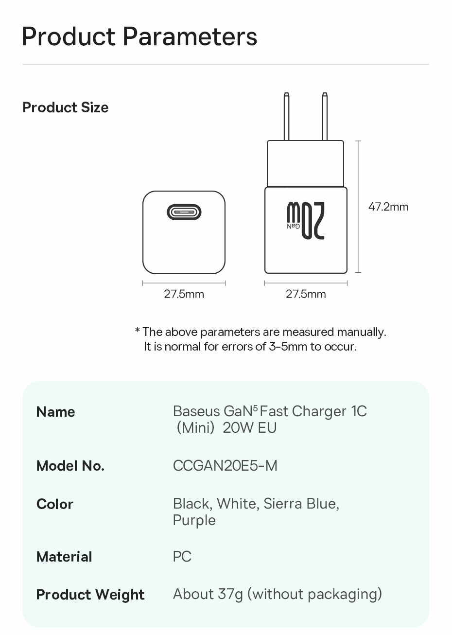 Baseus OS GaN5 Fast Charger Mini 1C 20W EU Blue CCGN050103