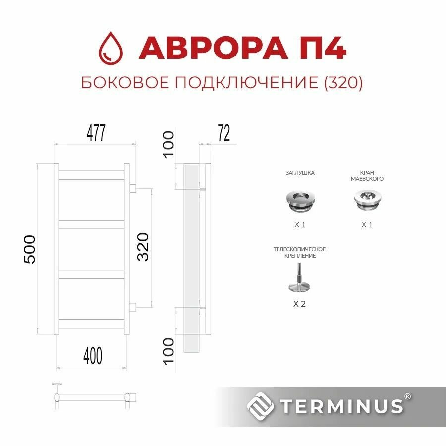 Полотенцесушитель водяной с боковым подключением TERMINUS (Терминус) Аврора П4 400х500 б/п 320 мм , сверхпрочная нержавеющая сталь, , гарантия 10 лет/ Водяной полотенцесушитель для ванной