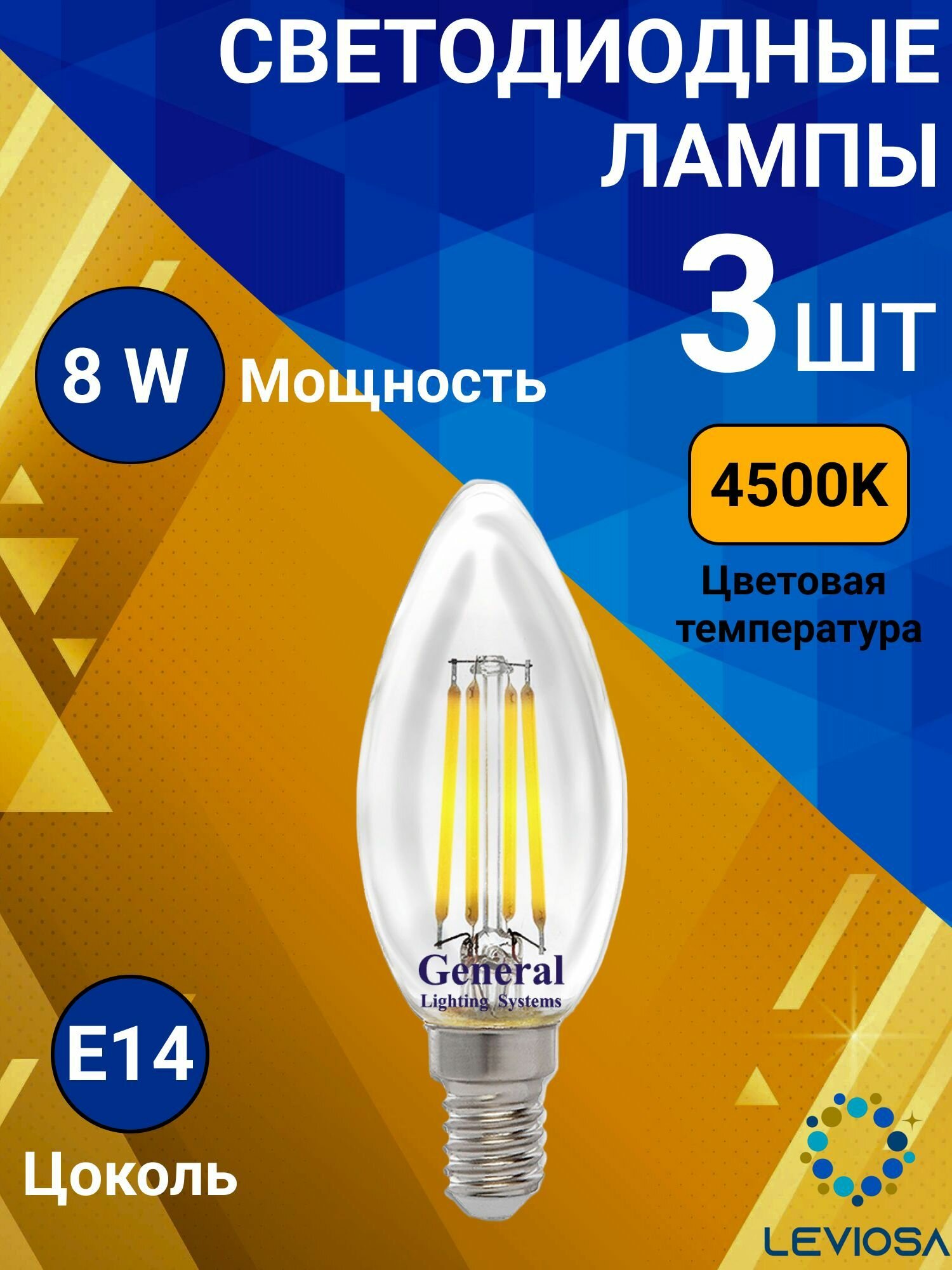 Купить Светодиодные лампы филаментная диммируемая, General, Комплект из 3 шт., Мощность 8 Вт, Цоколь E14, Нейтральный свет