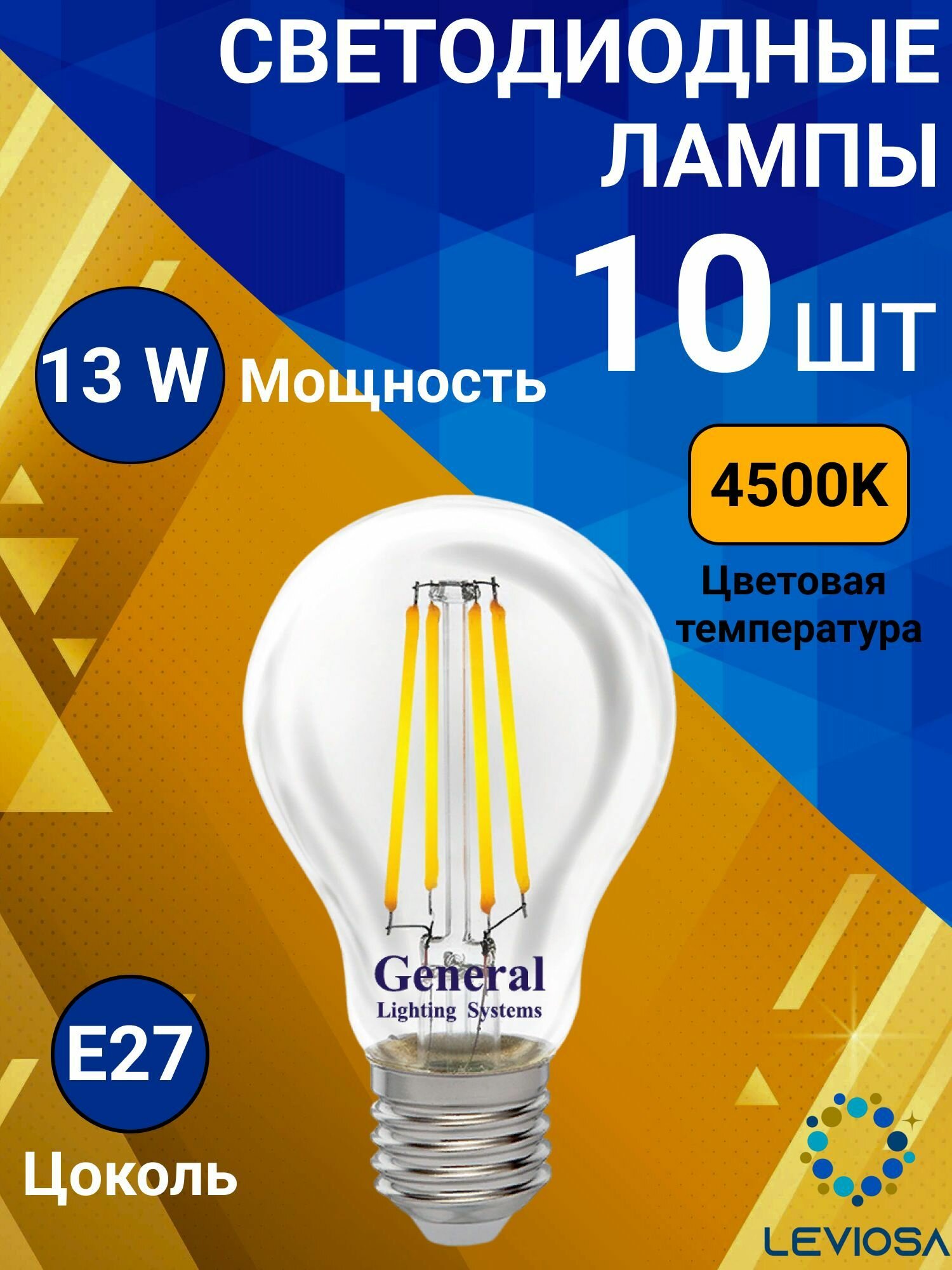 Купить Светодиодные лампы филаментная диммируемая, General, Комплект из 10 шт., Мощность 13 Вт, Цоколь E27, Нейтральный свет
