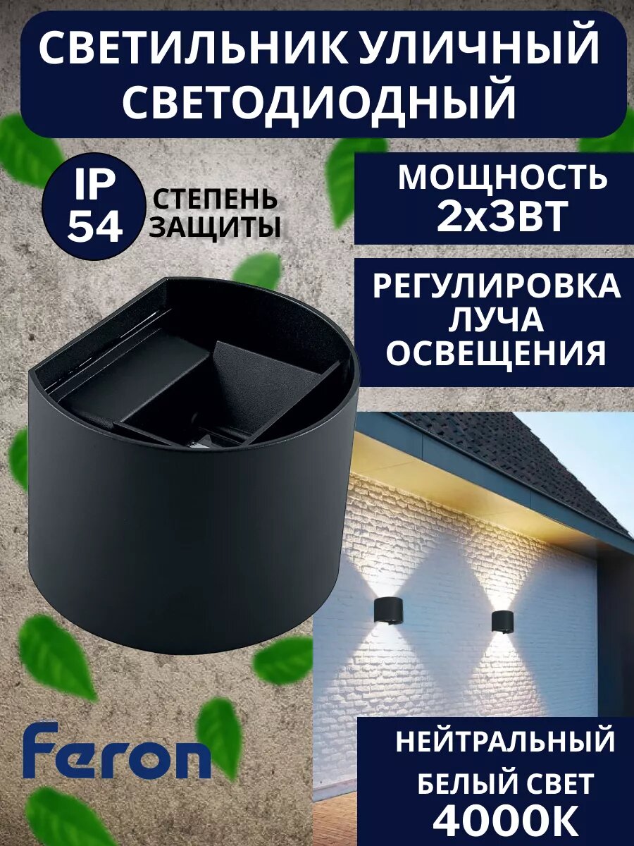 Светильник светодиодный уличный ДБУ-2х3w вверх/вниз 4000К IP54 черный | код 11872 | FERON (1 шт.)