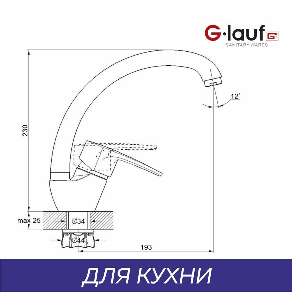 Смеситель для кухни 40к Glauf 8G4-A180 бок.ручка, п/гайку