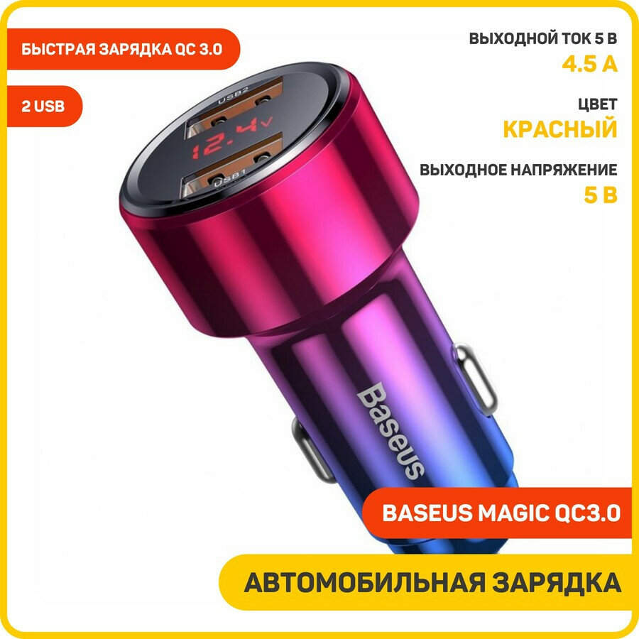 Автомобильное зарядное устройство (АЗУ) Baseus Magic QC 3.0 (2 USB) с дисплеем, 5 А, красный