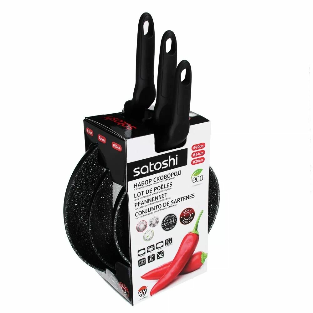 Набор сковород Satoshi Стоун 20 см, 24 см, 28 см с антипригарным покрытием под мрамор, индукция, без крышек интересное: