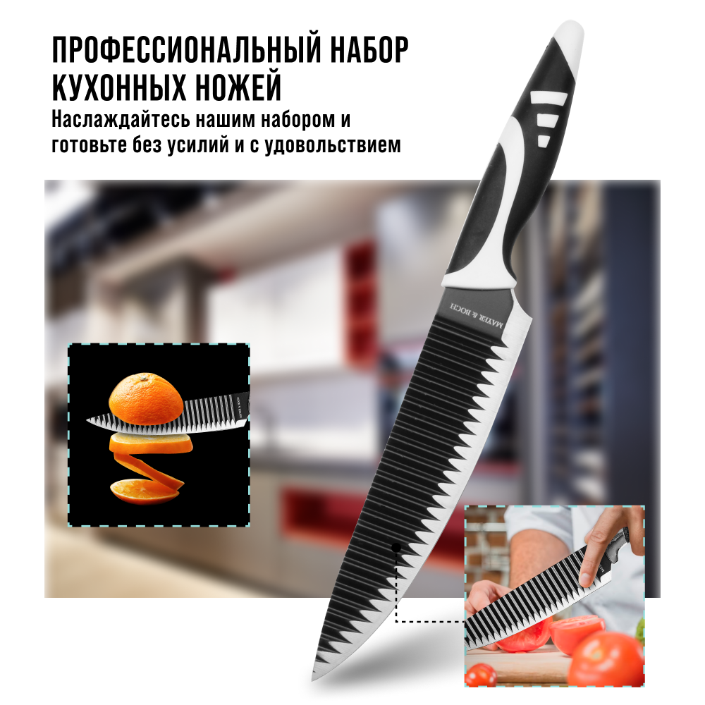 | Типы ножей в наборе | нож для овощей, универсальный нож, нож для хлеба, разделочный нож, шеф-нож |