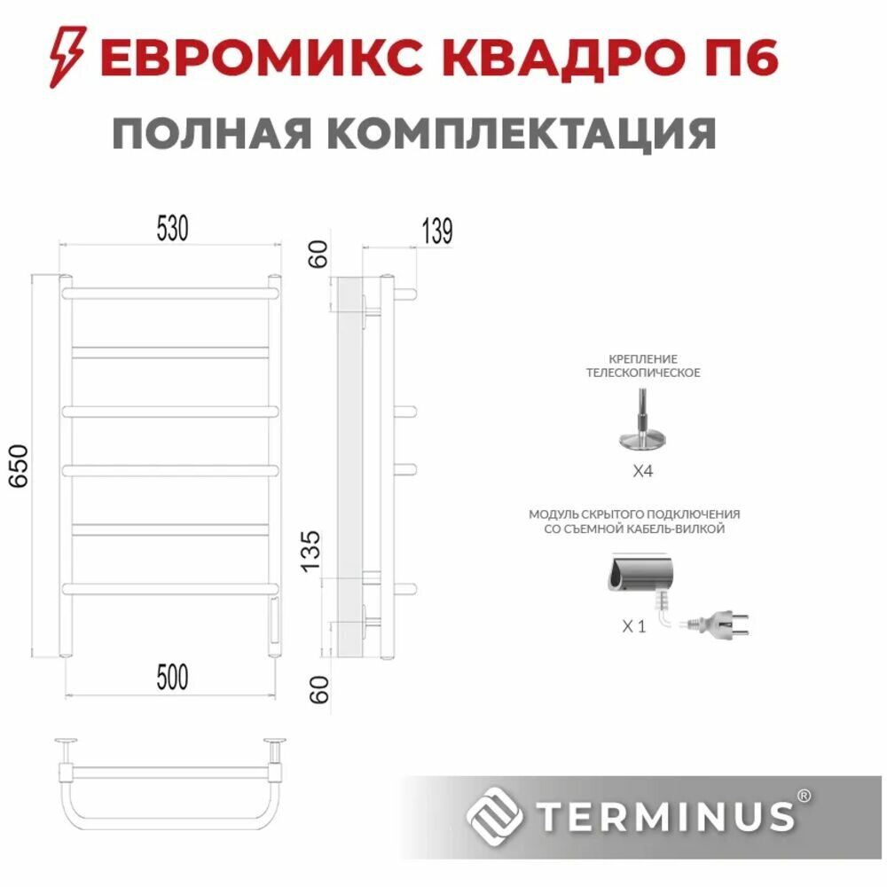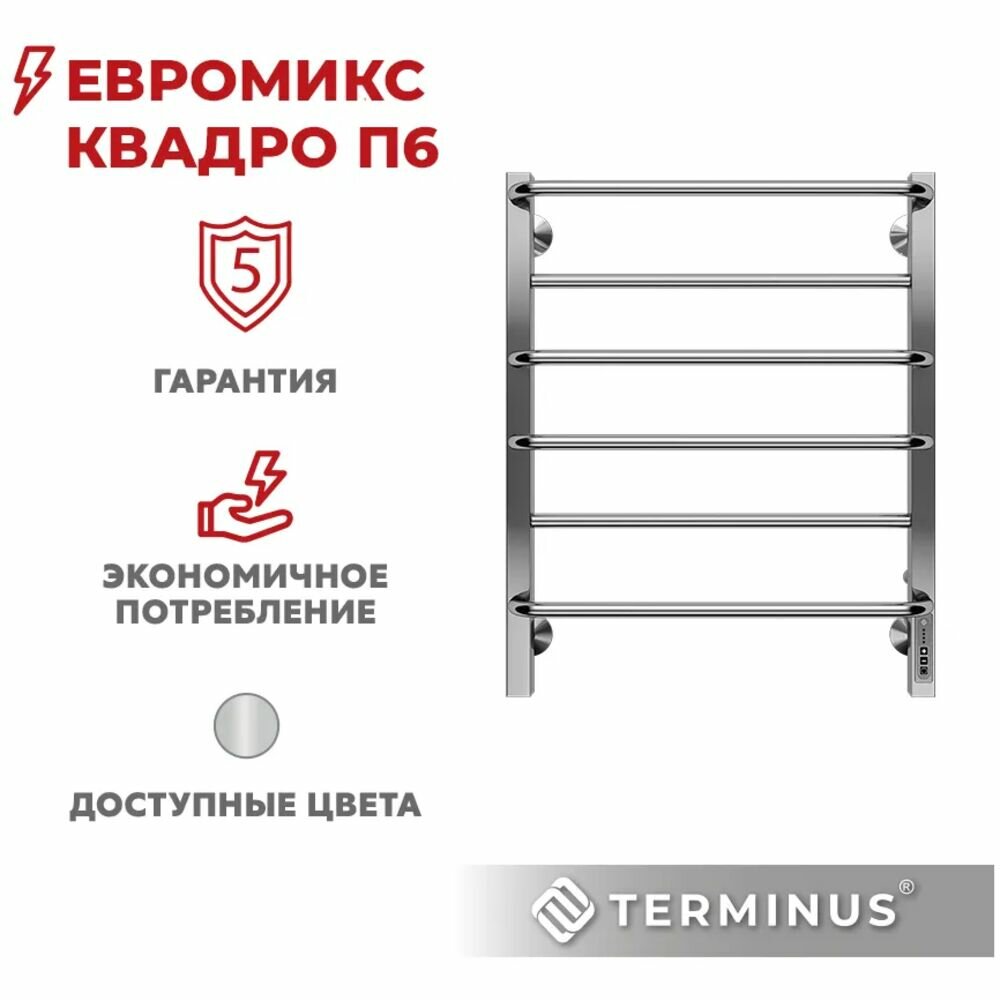 Полотенцесушитель электрический TERMINUS (Терминус) Евромикс квадро П6 400х650 мм, сверхпрочная пищевая нержавеющая сталь, диммер 5-ого поколения Quick Touch, гарантия 5 лет/ Электрический полотенцесушитель с терморегулятором