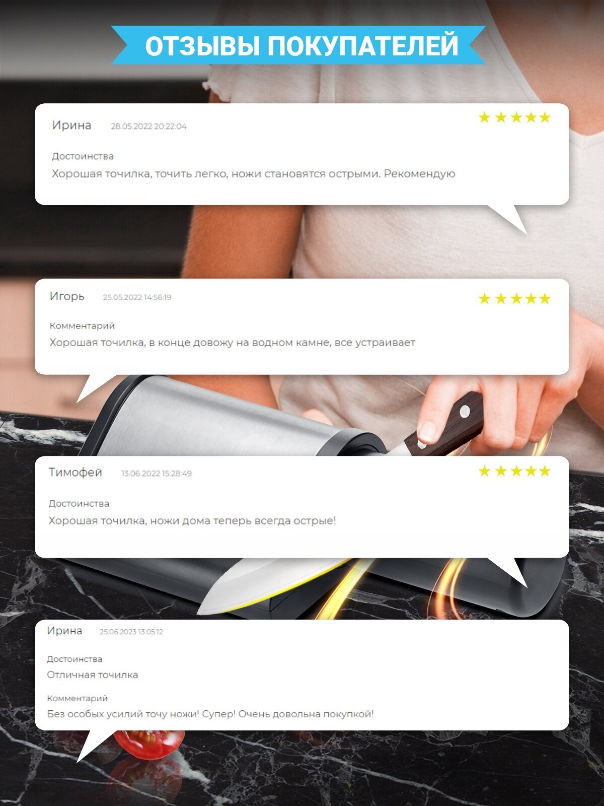 | Плюсы: | Прекрасно справляется с задачей правки и заточки ножей, экономит время. Достойное качество. |