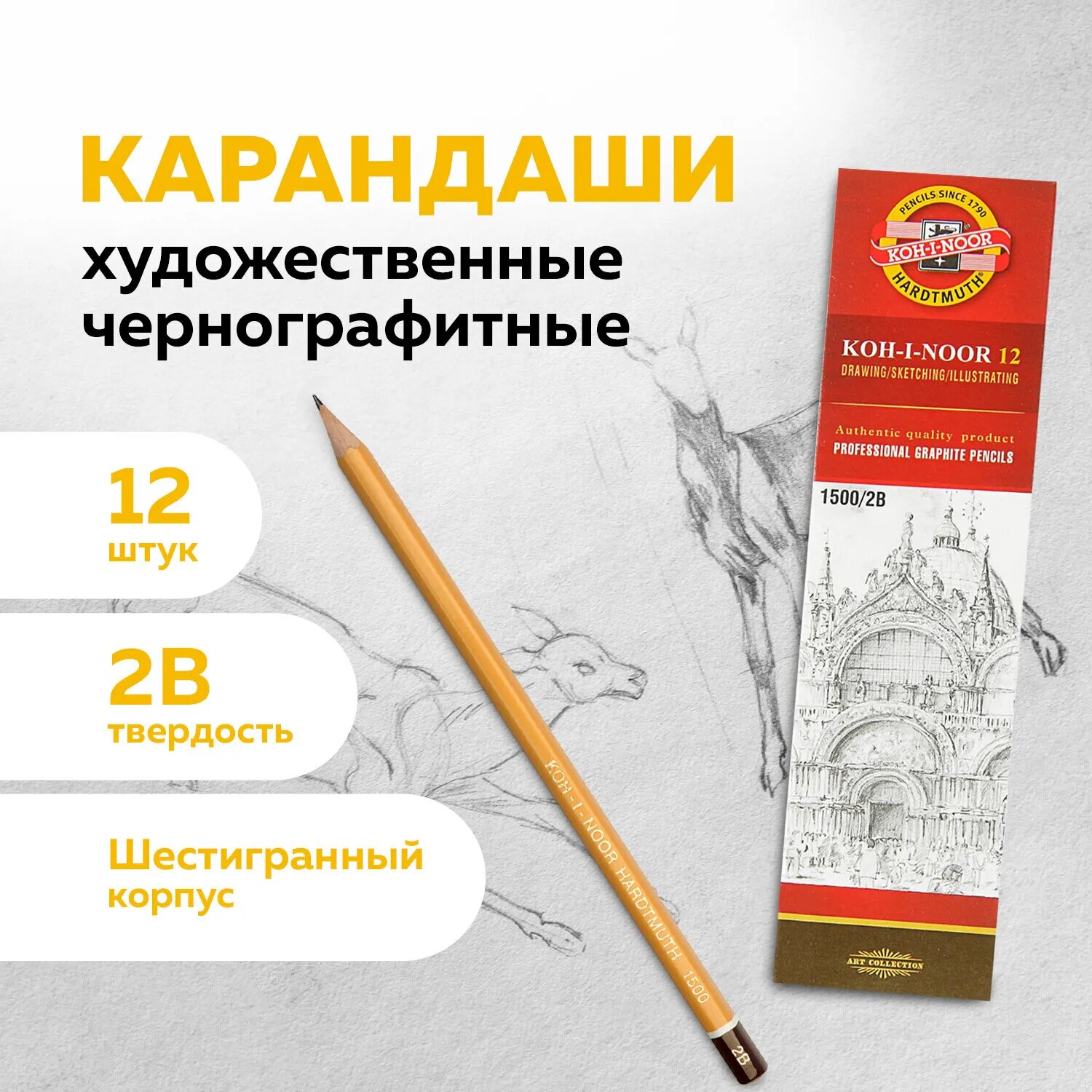 Карандаш чернографитный KOH-I-NOOR 1500, 1 штука, 2B, без резинки, корпус желтый, заточенный (150002B01170RU)