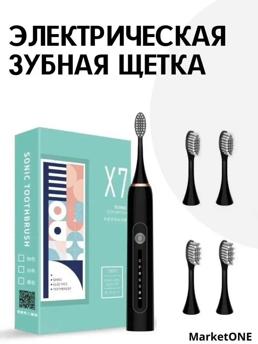 Электрическая ультразвуковая зубная щетка / 4 насадки / Зубная щетка / Sonic Toothbrush X7, черный