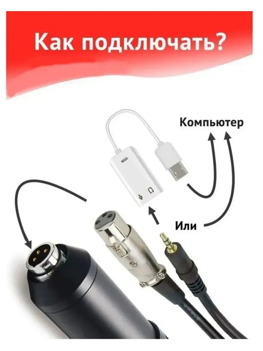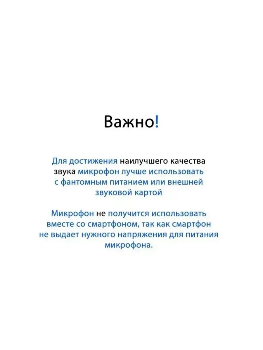 | Питание | для достижения более качественной записи голоса рекомендуется подключать микрофон через звуковую карту с фантомным питанием. Внимание: данный микрофон не подходит для подключения напрямую к телефону/ компьютеру. |