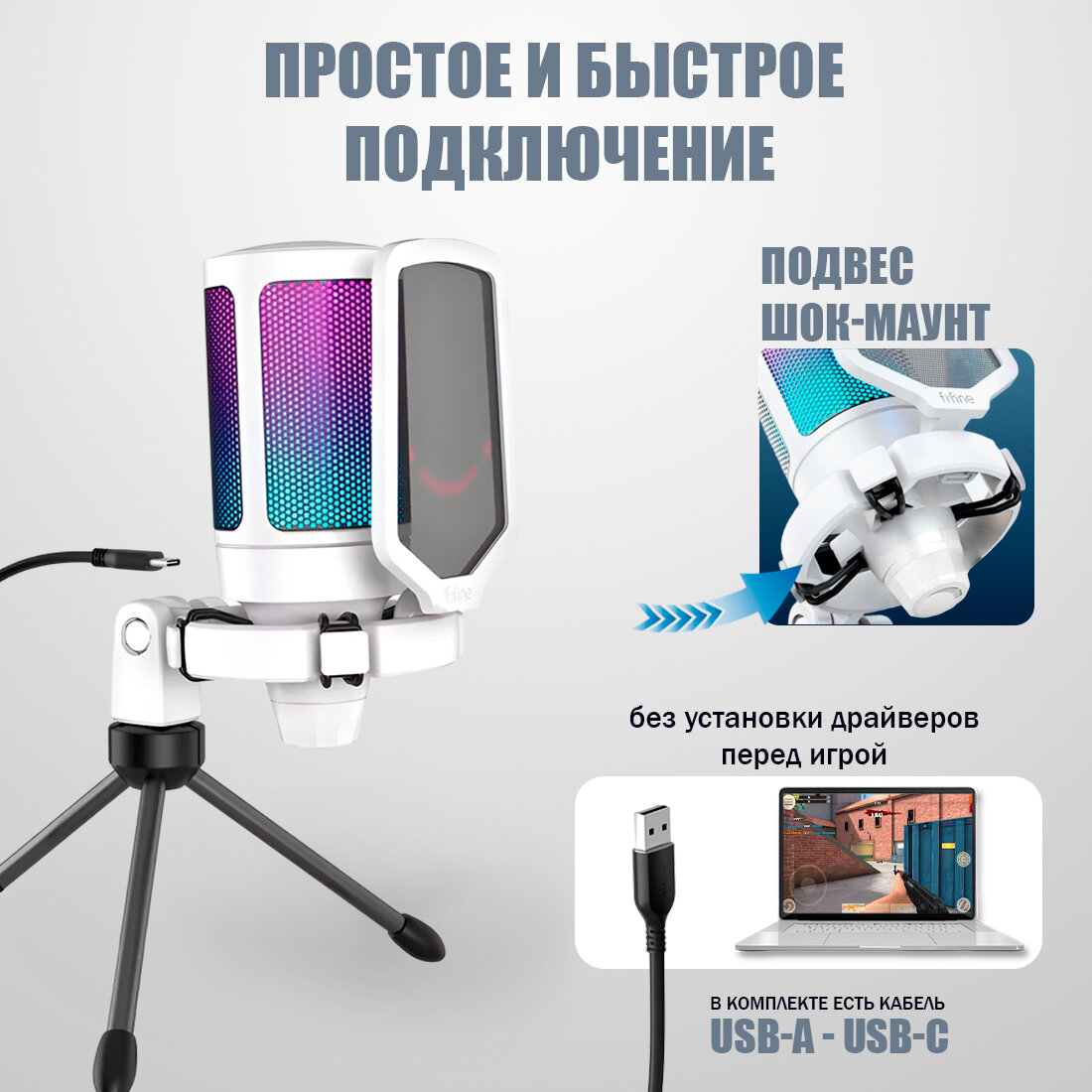 Конденсаторный USB-микрофон Fifine AmpliGame A6V с RGB-подсветкой (White)