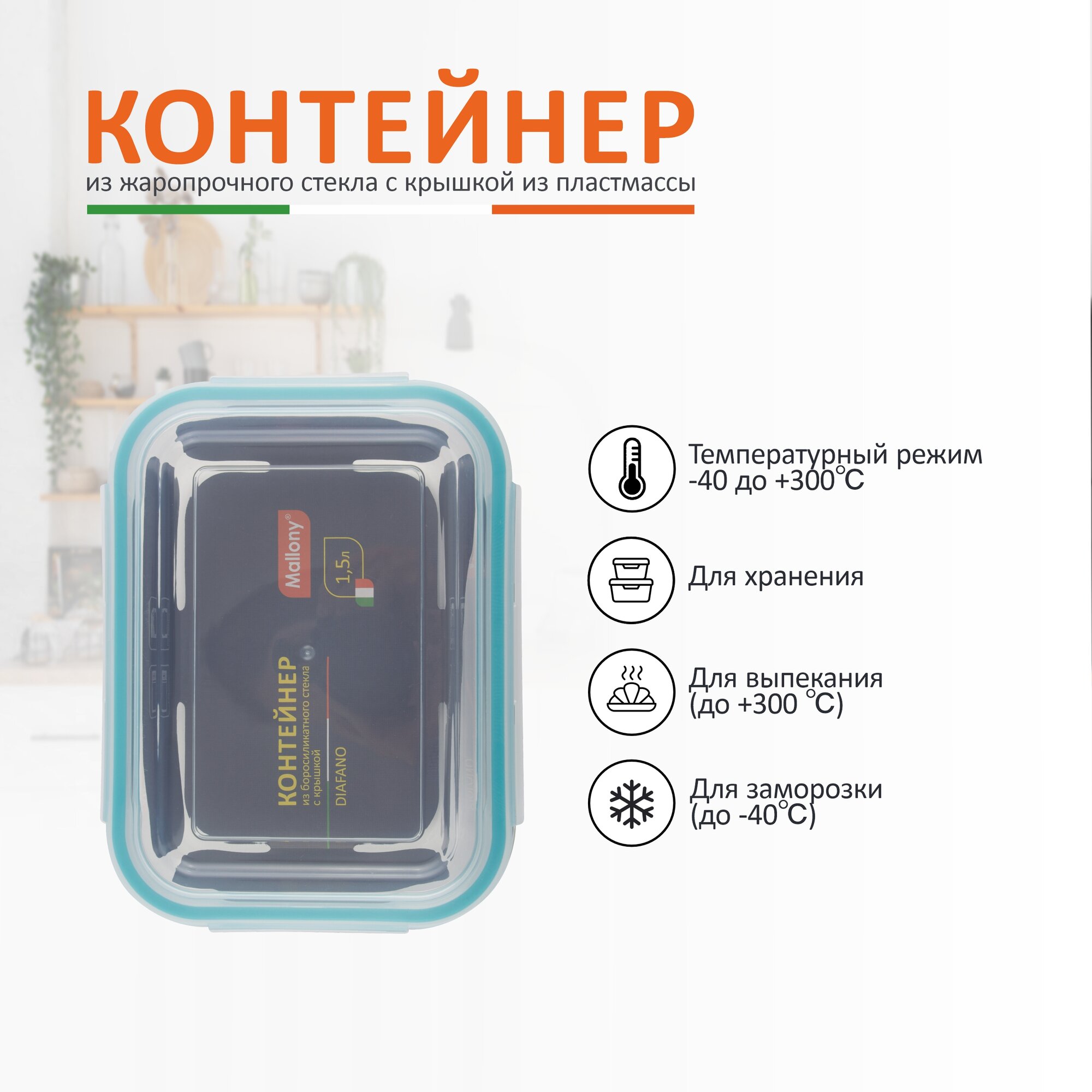 Контейнер Mallony Diafano 1,5 л, жаропрочное стекло, пластиковая крышка