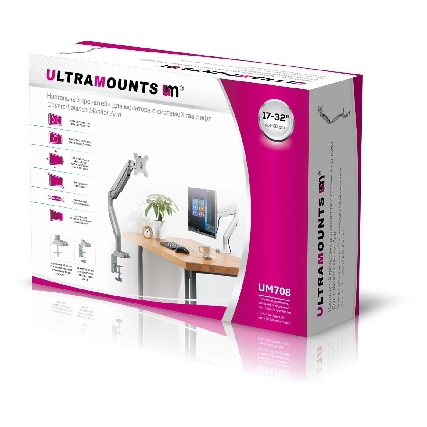 Кронштейн для мониторов Ultramounts UM708 серебристый 17-32 макс.9кг крепление к столешнице поворот и наклон
