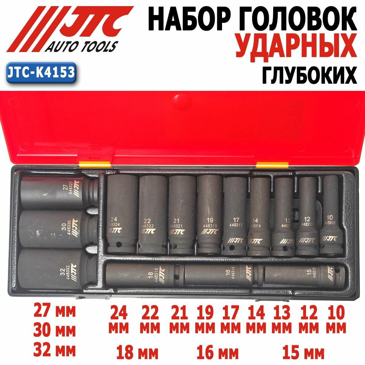 JTC JTC-K4153 Набор головок торцевых глубоких ударных 12-гранных 1/2 10-32мм (в кейсе) 15шт JTC /1 1шт