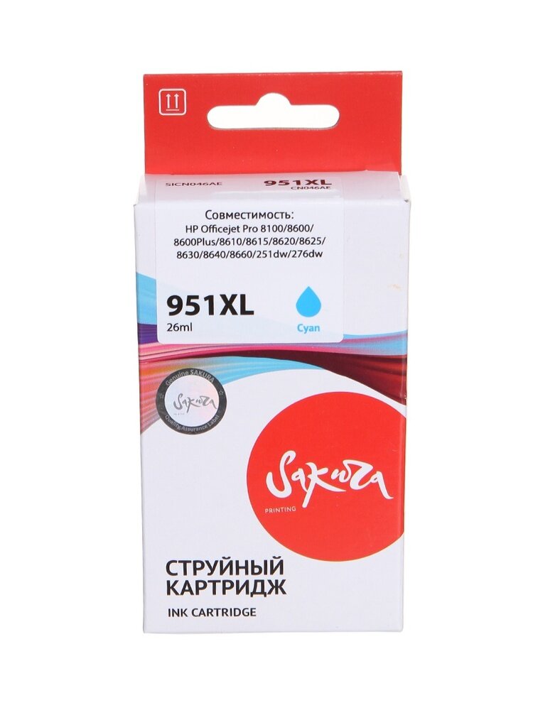 Картридж CN046AE (№951XL Cyan) для HP, струйный, голубой, 26 мл, 1500 страниц, Sakura