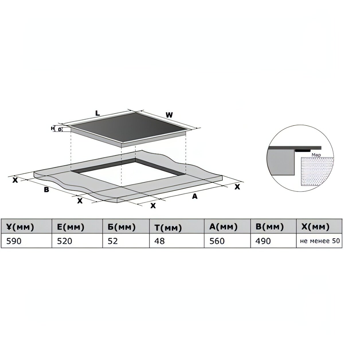 | Безопасность | защитное отключение конфорок / кнопка блокировки панели / индикатор остаточного тепла |