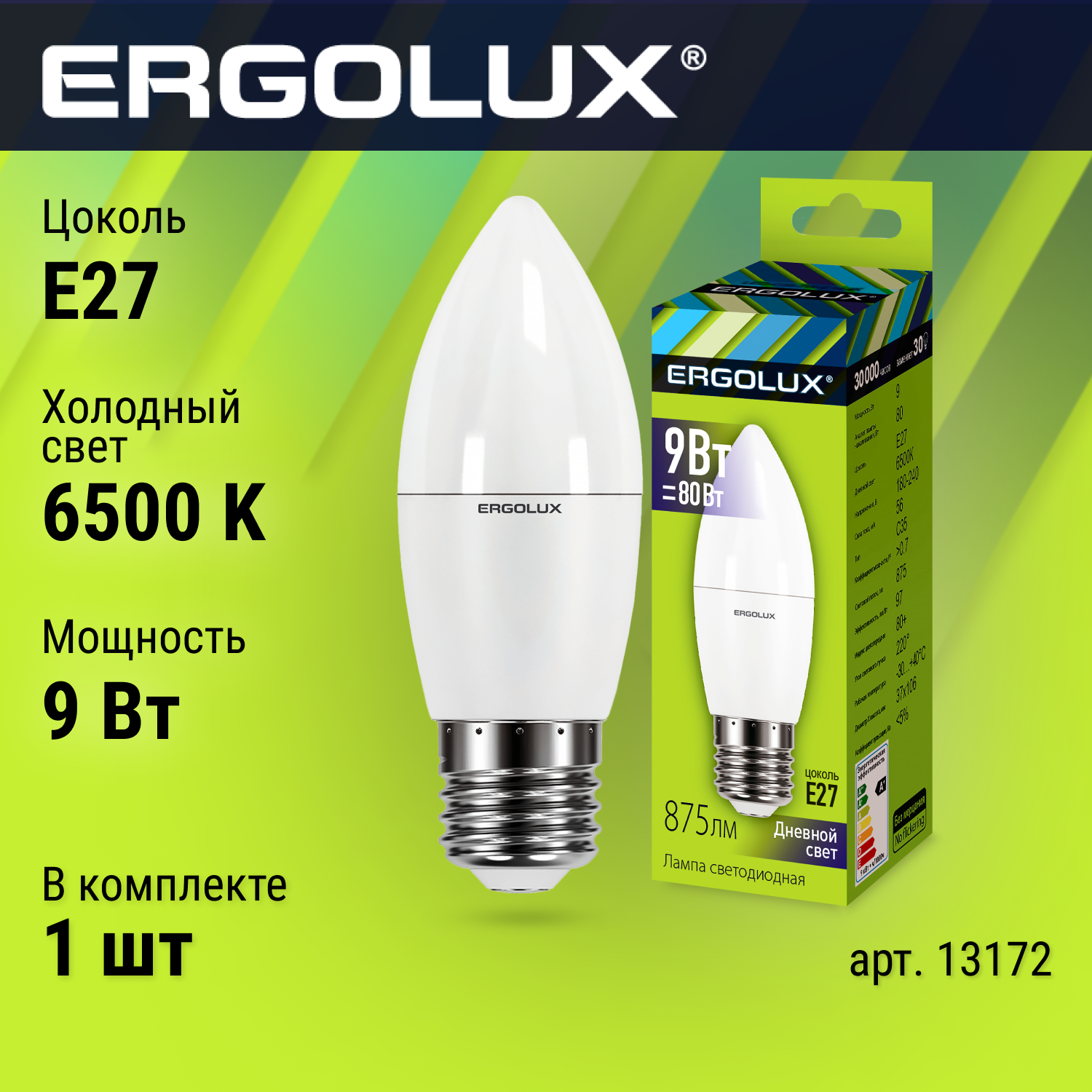 Лампа светодиодная Ergolux 13172, E27, C35, 9 Вт, 6500 К