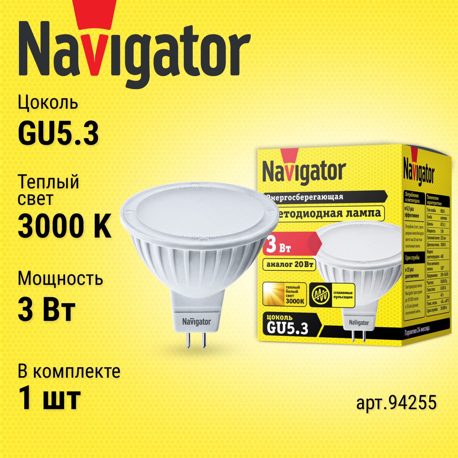 Лампа светодиодная Navigator 94255, GU5.3, MR16, 3 Вт, 3000 К