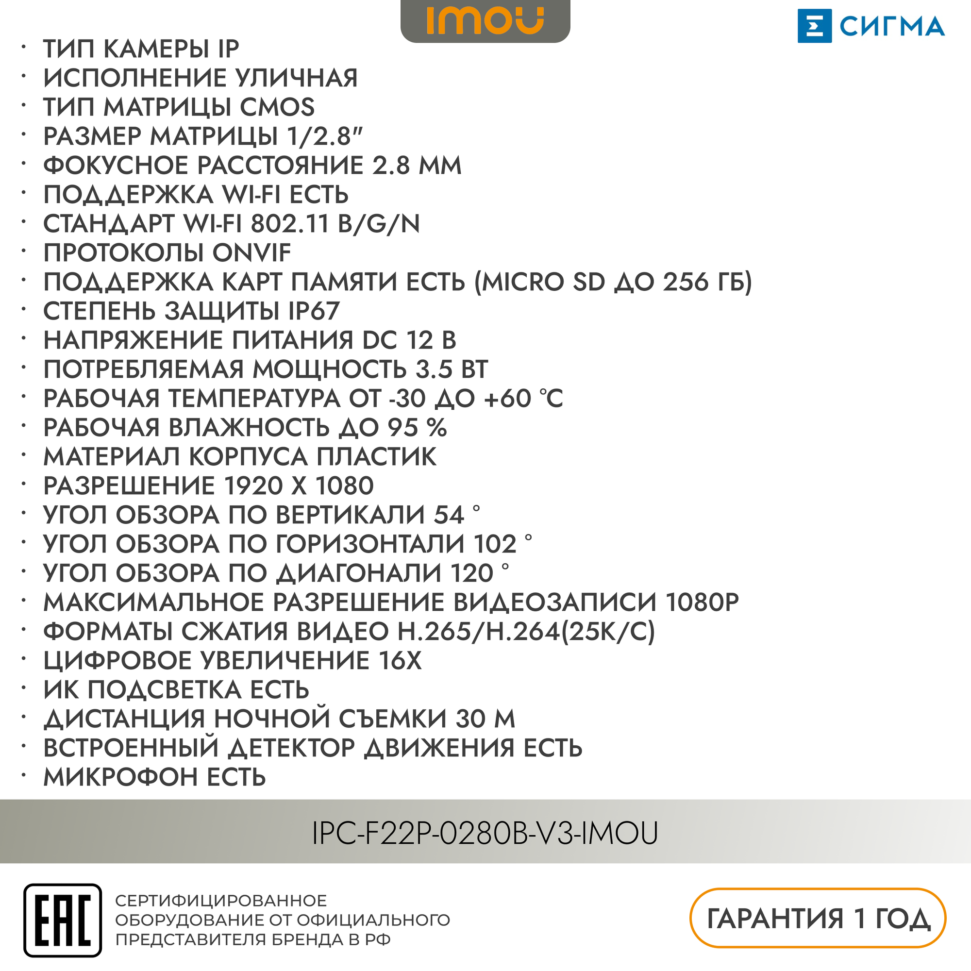 IMOU Bullet 2C IPC-F22P-0280B-imou 2Мп 2,8 мм - камера видеонаблюдения WiFi уличная, умная цифровая IP видеокамера для улицы с ИК-подсветкой, 1920x1080 Full HD, H.265/H.264, CMOS 1/2.8"