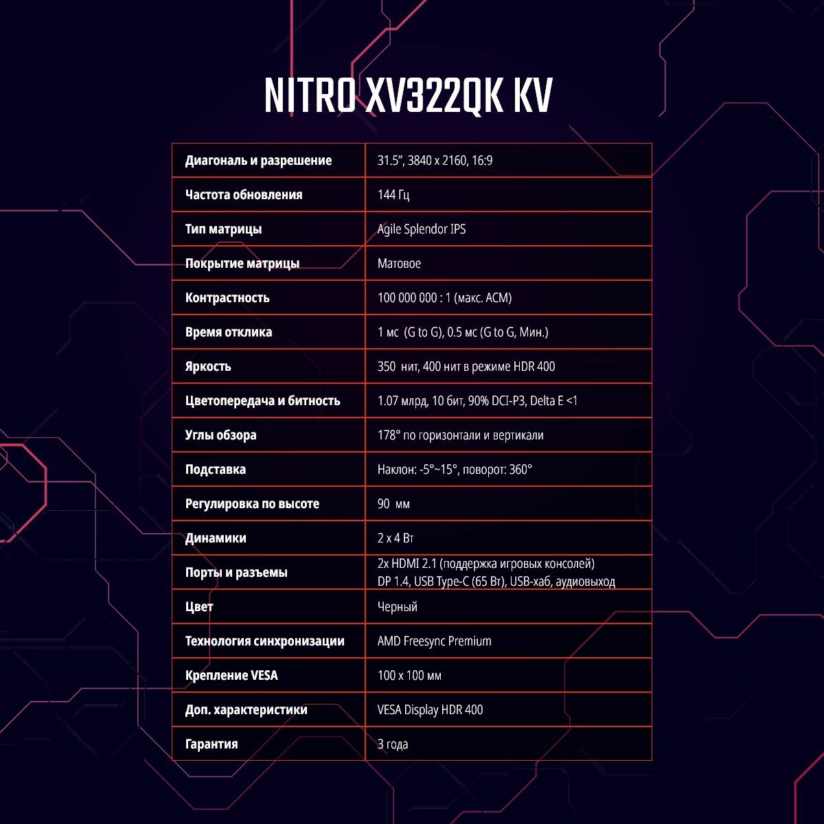 Монитор 31.5 Acer Nitro XV322QKKVbmiiphuzx Black регулировка по высоте (IPS, 3840х2160, 144Hz, 1ms, 178°/178°,400 cd/m,