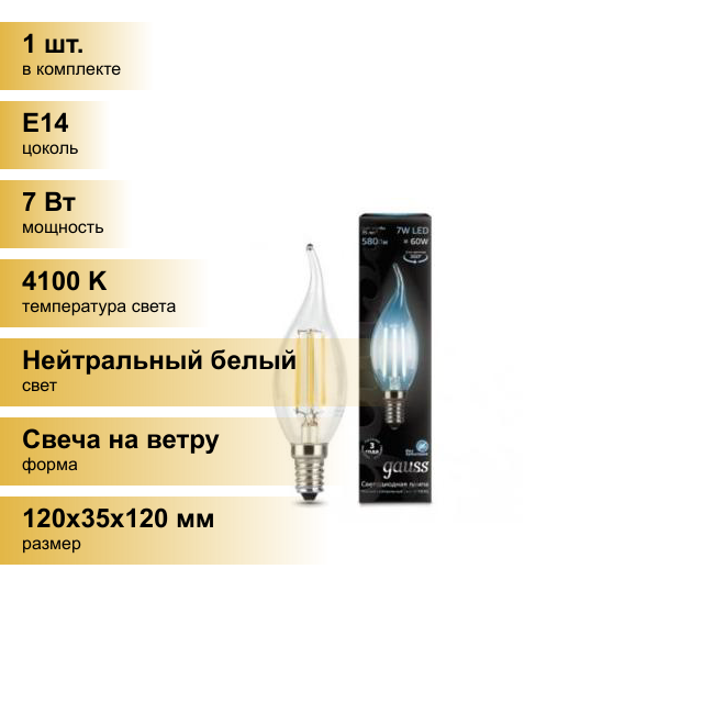 (10 шт.) Светодиодная лампочка Gauss Filament Свеча на ветру E14 7W(580lm) 4100K 4K прозр. 120x35 филамент (нитевидная), 104801207 Нейтральный белый. Цоколь E14